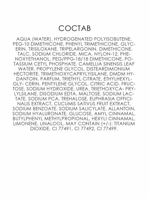 | Состав | aqua (water), hydrogenatedpolyisobutene, peg-10 dimethicone, phenyltrimethicone, glycerin, trisiloxane, tripelargonin, dimethicone, talc, sodiumchloride, mica, nylon-12, phenoxyethanol, peg/ppg-18/18 dimethicone, potassiumcetylphosphate, camelliasinensisleafwater, propyleneglycol, disteardimoniumhectorite, trimethoxycaprylylsilane, dmdmhydantoin, parfum, triethylcitrate, ethylhexylglycerin, pentyleneglycol, citricacid, fructose, sodiumhydroxide, urea, triethoxycaprylylsilane, disodiumedta, maltose, sodiumlactate, sodiumpca, trehalose, euphrasiaofficinalisextract, cucumissativusfruitextract, sodiumbenzoate, sodiumsalicylate, allantoin, sodiumhyaluronate , glucose, amylcinnamal, butylphenylmethylpropional, hexylcinnamal, limonene, linalool. may contain (+/-): titanium dioxide, ci 77491, ci 77492, ci 77499 |