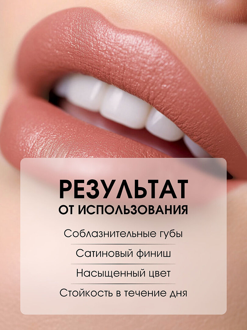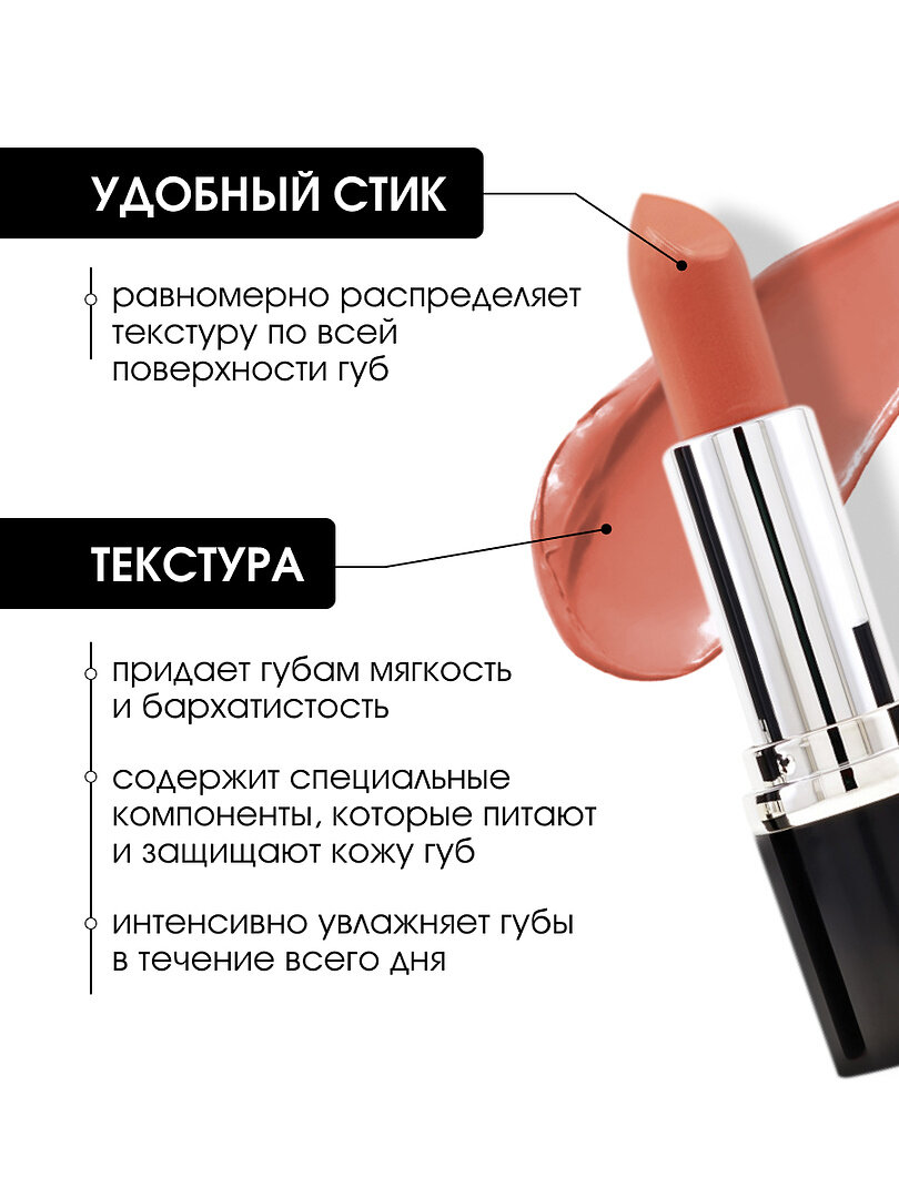 | Дополнительная информация | Матовое покрытие, насыщенный стойкий цвет. Легко наносится, придает губам мягкость и бархатистость, сияющий блеск и ощущение комфорта. Увлажнение губ в течение всего дня. |