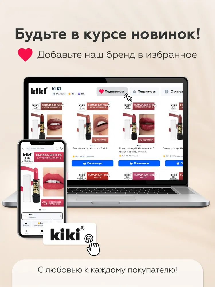 | Дополнительная информация | в состав классической губной помады KIKI введены группы витаминов и масел, которые защищают, разглаживают, смягчают губы и усиливают передачу глубины цвета; активный ингредиент: витамин E; масла и экстракты: масло алоэ вера |