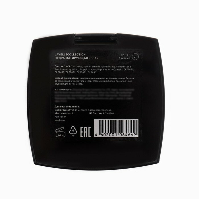 LavelleCollection Пудра для лица компактная матирующая SPF-15, тон 01 светлый