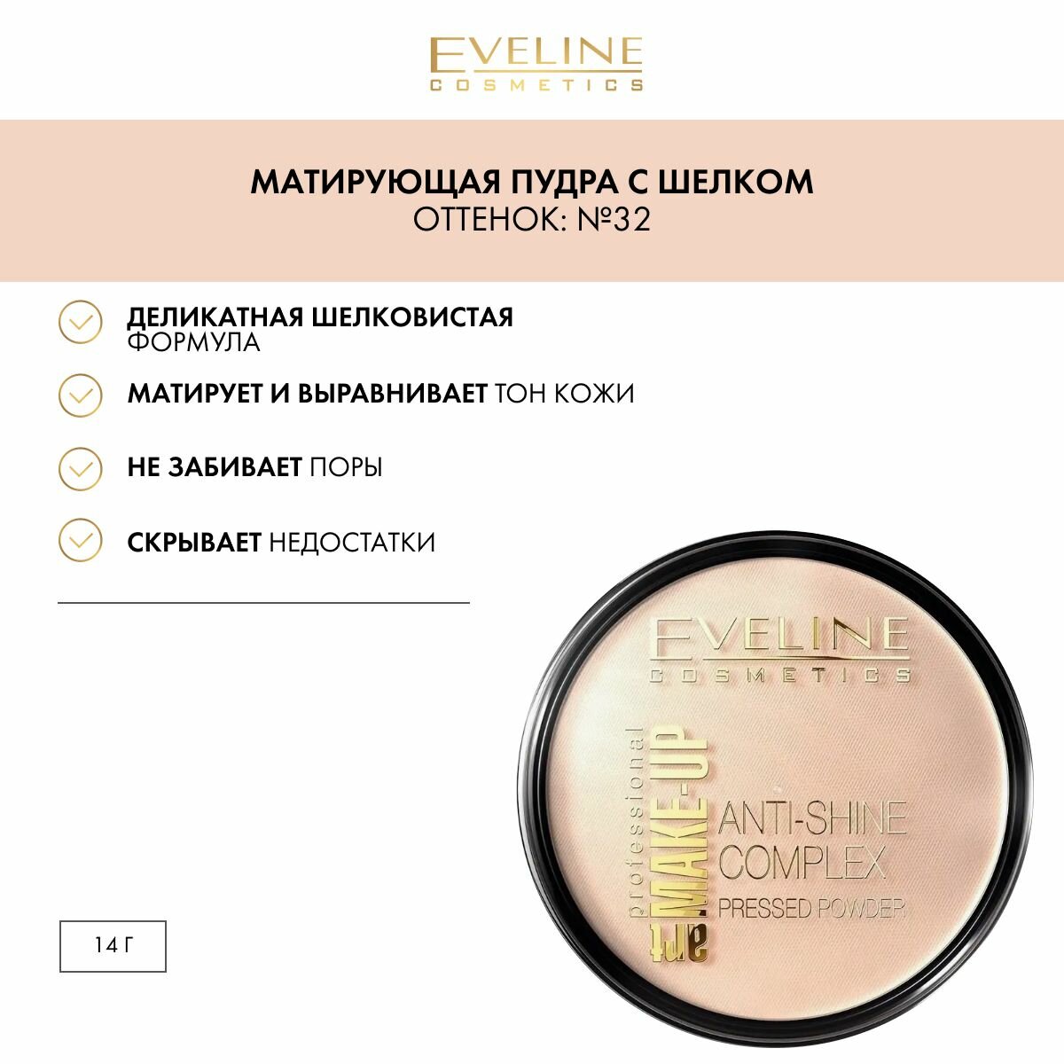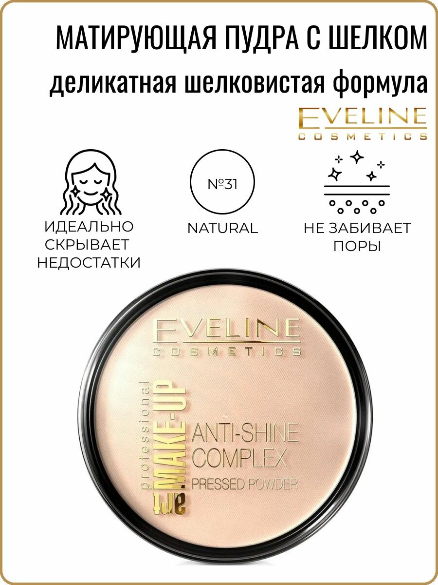 Купить EVELINE Пудра для лица ANTI-SHINE COMPLEX PRESSED POWDER матирующая минеральная с шелком №32 NATURAL, 14 гр