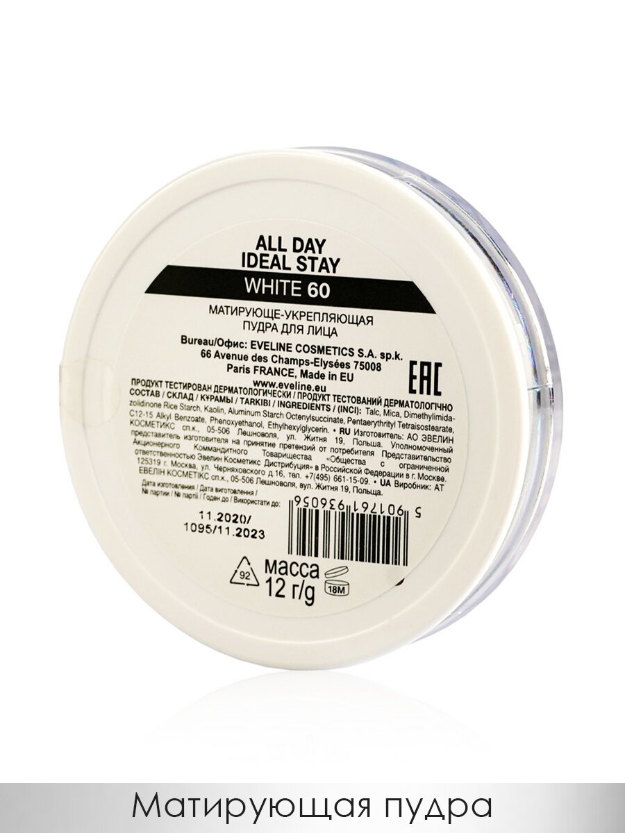 Купить EVELINE Пудра для лица ALL DAY IDEAL STAY матирующе-укрепляющая №60 WHITE, 12 гр