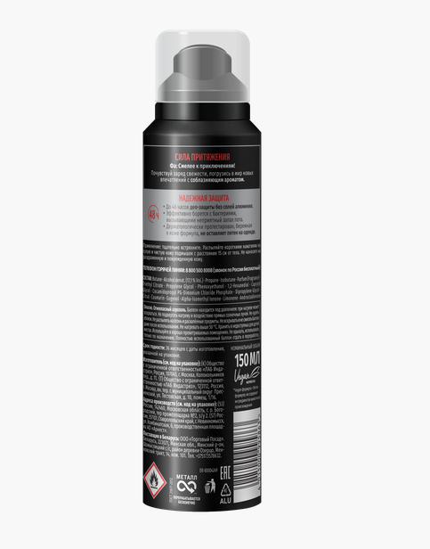 | Состав | butane, alcohol denat., propane, isobutane, triethyl citrate, parfum, phenoxyethanol, polyglyceryl-3 caprylate, butyloctanoic acid, linalool, limonene, buthylphenyl methylpropional, dypropylene glycol, alpha-isomethyl ionone, coumarin, eugenol, benzyl alcohol, androstadienone |