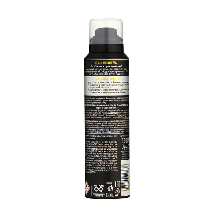 | Состав | butane, alcohol denat., isobutane, propane, triethyl citrate, parfum, paullinia cupana seed extract, phenoxyethanol, polyglyceryl-3 caprylate, benzyl salicylate, linalool, butyloctanoic acid, limonene, glycerin, hexyl cinnamal, citronellol, citral, geraniol, benzyl alcohol |