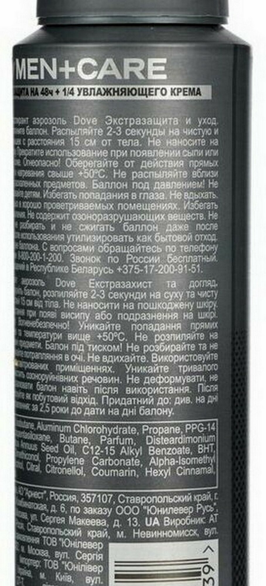 Дезодорант-аэрозоль Dove мужской, Экстразащита и уход, 150 мл (68271298)