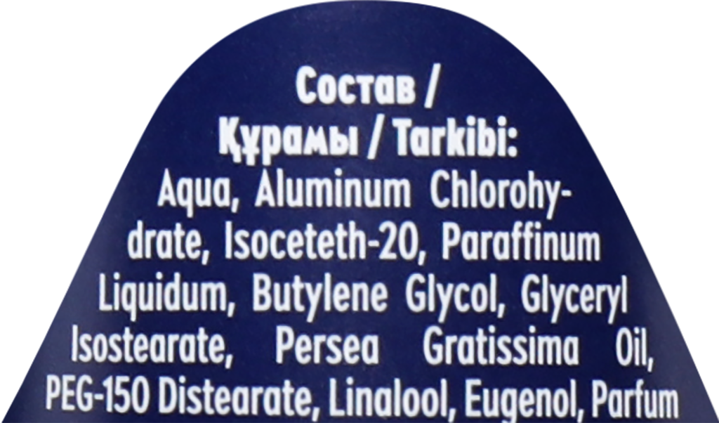 | Состав | Butane, Isobutane, Propane, Cyclomethicone, Aluminum Chlorohydrate, C12-15 Alkyl Benzoate, Isopropyl Palmitate, Parfum, Palmitamidopropyltrimonium Chloride, Octyldodecanol, Propylene Glycol, Disteardimonium Hectorite, Propylene Carbonate, Dimethiconol, Benzyl Salicylate, Benzyl Alcohol, Linalool, Citronellol, Limonene, Geraniol |