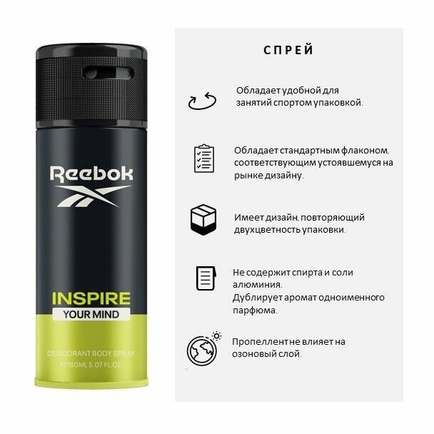 REEBOK INSPIRE YOUR MIND мужской дезодорант-спрей для тела 150 мл (Из Финляндии)
