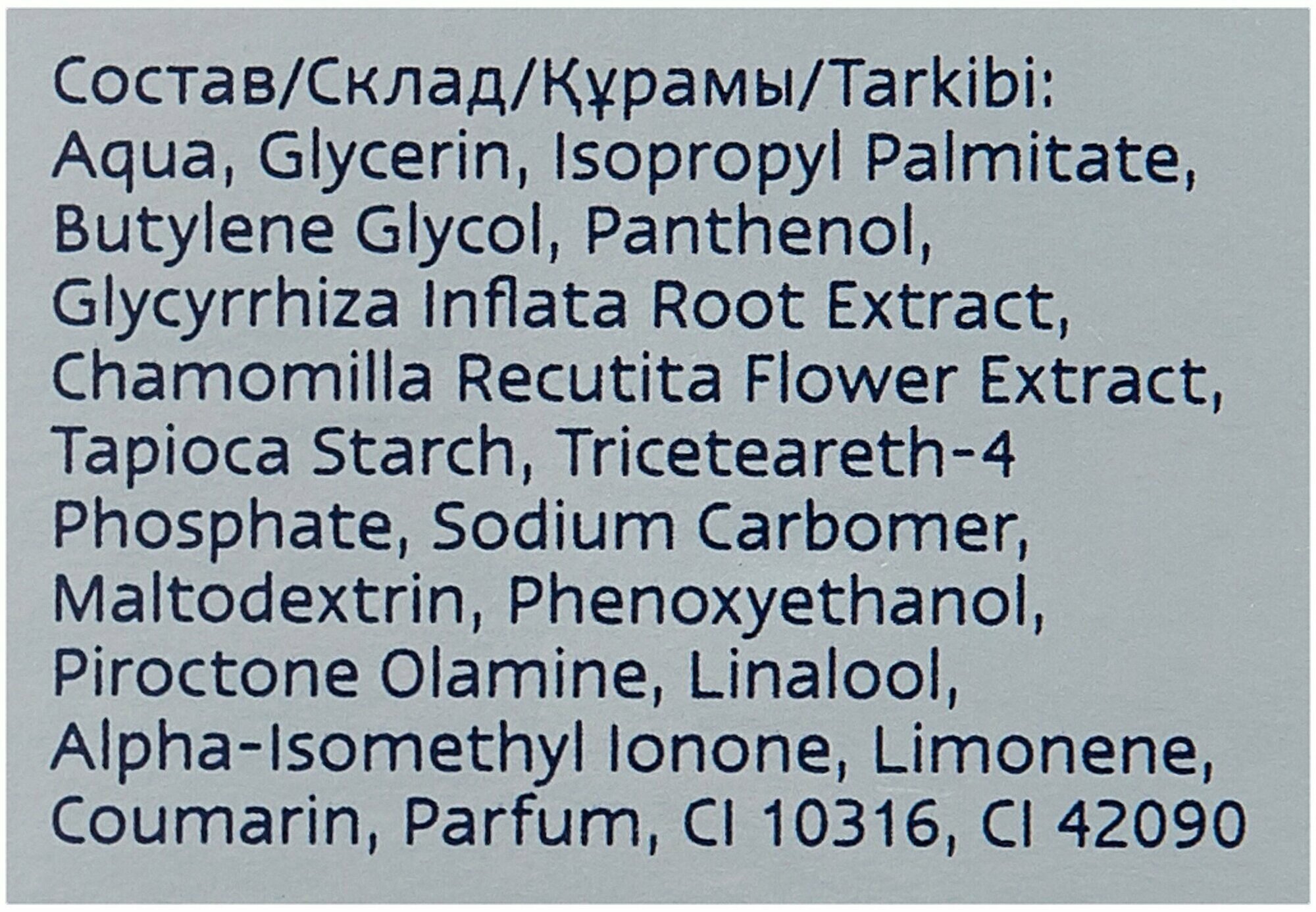 | Состав | вода, глицерин, изопропилпальмитат, бутиленгликоль, пантенол, экстракт корня глицирризы надувной, экстракт цветков ромашки обыкновенной, крахмал тапиоки, трицетирет-4 фосфат, карбомер натрия, мальтодекстрин, феноксиэтанол, пироктон оламин, линалоол, альфа-изометил ионон, лимонен, кумарин, парфюм, ci 10316, ci 42090 |
