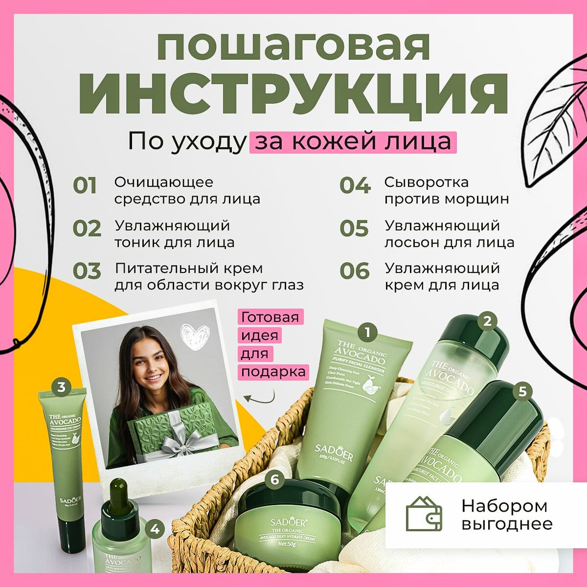 Подарочный набор уходовой косметики для лица подарочный Sadoer интересное: