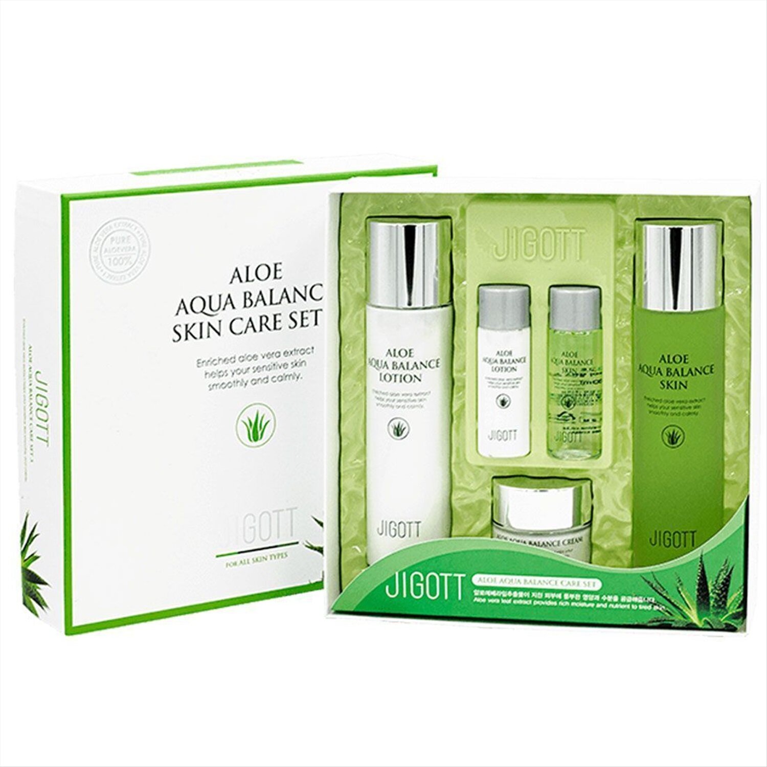 JIGOTT ALOE AQUA BALANCE SKIN CARE 3SET Набор: Увлажняющий тонер для лица с экстрактом алоэ, Увлажняющий лосьон для лица с экстрактом алоэ, Увлажняющи 150мл+150мл+30мл+30мл+50мл