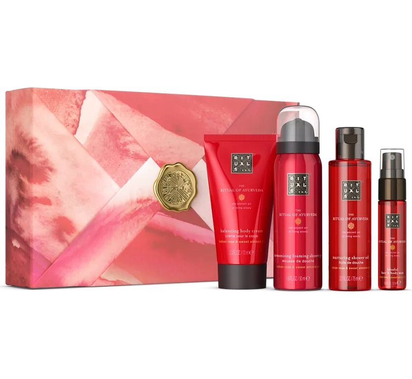 Купить Подарочный набор косметики для ухода RITUALS "Ayurveda" масло сладкого миндаля и индийская роза/Гель для душа 50мл, Крем для тела 70мл, Масло для душа 75мл, Спрей для тела и волос 20мл