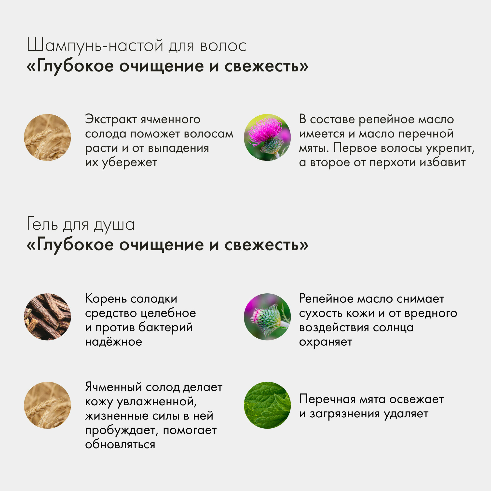 | В наборе | Шампунь-настой для волос «Глубокое очищение и свежесть» Гель для душа «Глубокое очищение и свежесть» |