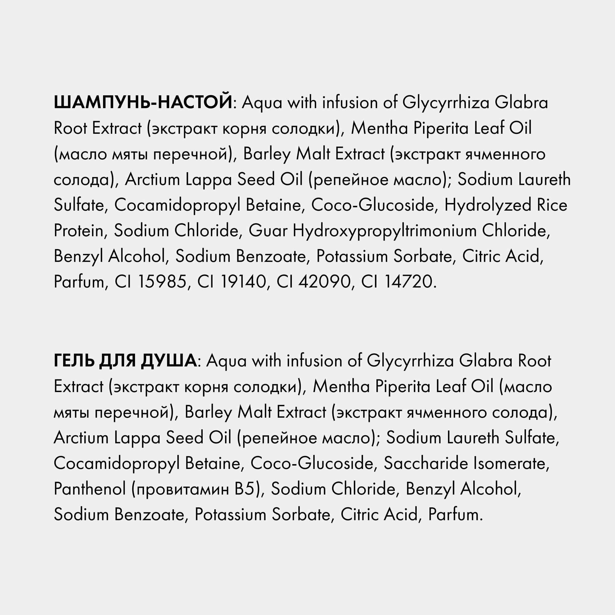 | Состав | Состав: Шампунь-настой Состав Ingredients: Aqua with infusion of Glycyrrhiza Glabra Root Extract (экстракт корня солодки) / Mentha Piperita Leaf Oil (масло мяты перечной) / Barley Malt Extract (экстракт ячменного солода) / Arctium Lappa Seed Oil (репейное масло); Sodium Laureth Sulfate / cocamidopropyl betaine / Coco-Glucoside / hydrolyzed rice protein / sodium chloride / guar hydroxypropyltrimonium chloride / Benzyl Alcohol / Sodium Benzoate / Potassium Sorbate / Citric Acid / Parfum / CI 15985 / CI 19140 / ci 42090 / CI 14720. Гель для душа Состав Ingredients: Aqua with infusion of Glycyrrhiza Glabra Root Extract (экстракт корня солодки) / Mentha Piperita Leaf Oil (масло мяты перечной) / Barley Malt Extract (экстракт ячменного солода) / Arctium Lappa Seed Oil (репейное масло); Sodium Laureth Sulfate / cocamidopropyl betaine / Coco-Glucoside / Saccharide Isomerate / Panthenol (провитамин В5) / sodium chloride / Benzyl Alcohol / Sodium Benzoate / Potassium Sorbate / Citric Acid / parfum. |