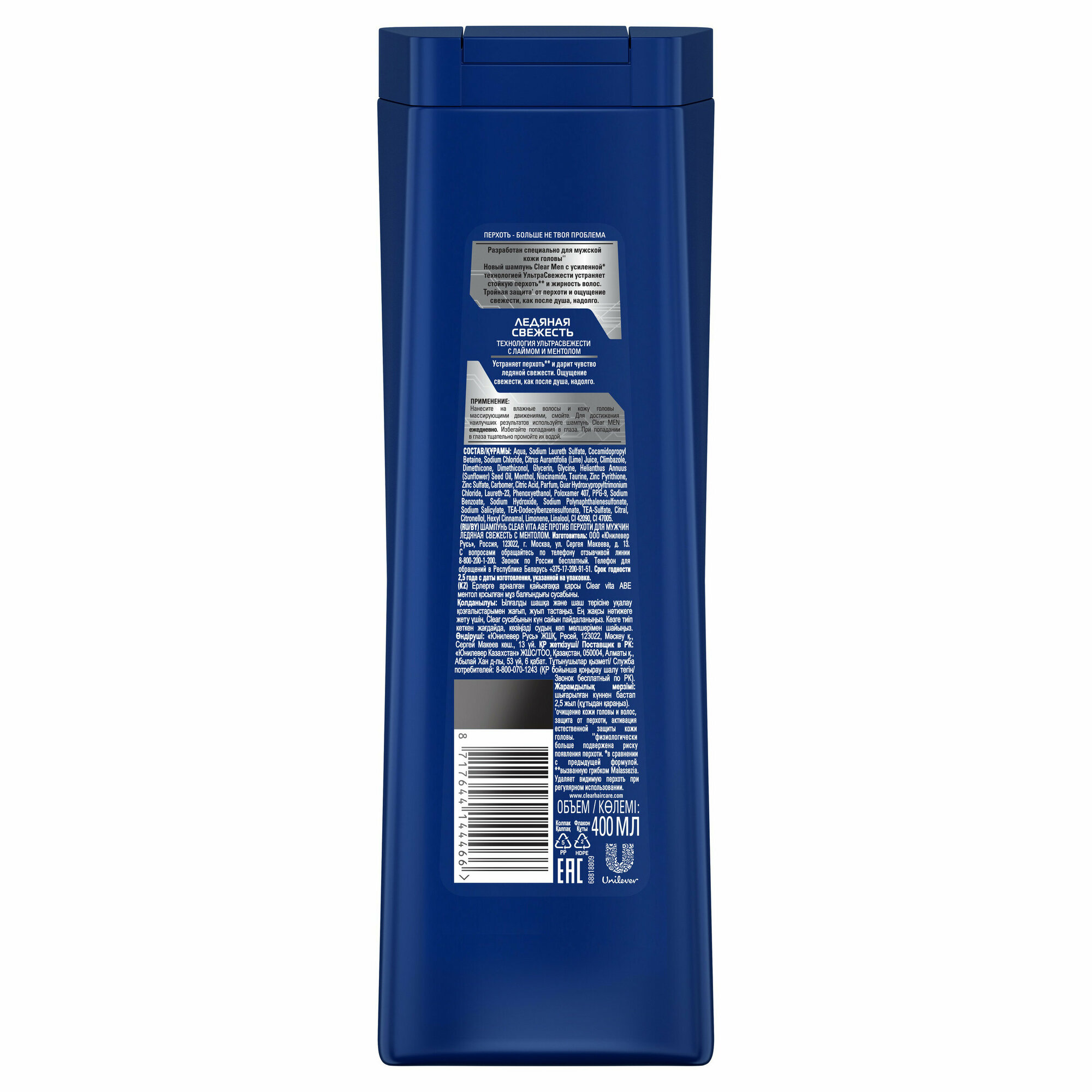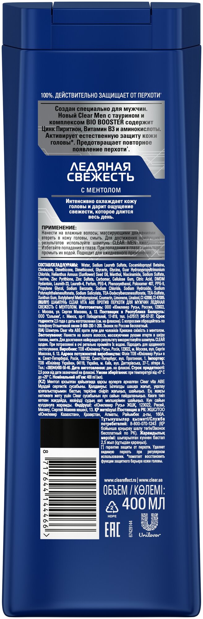 Шампунь против перхоти Clear Vita abe Для мужчин ледяная свежесть с ментолом, 400 мл