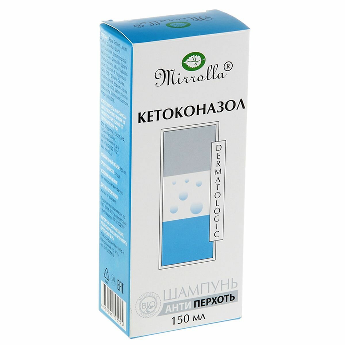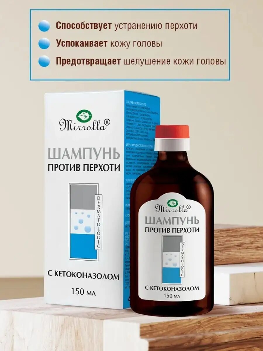 | Дополнительная информация | меры предосторожности: избегать попадания в глаза; при попадании тщательно промыть большим количеством теплой воды; возможны индивидуальная непереносимость компонентов, аллергические реакции, изменение цвета волос; не применять при беременности, лактации; шампунь рекомендуется применять один раз в три дня на протяжении месяца, для усиления эффекта рекомендуется применять вместе с пастой для волос «Кетоконазол» против перхоти «Мирролла» |