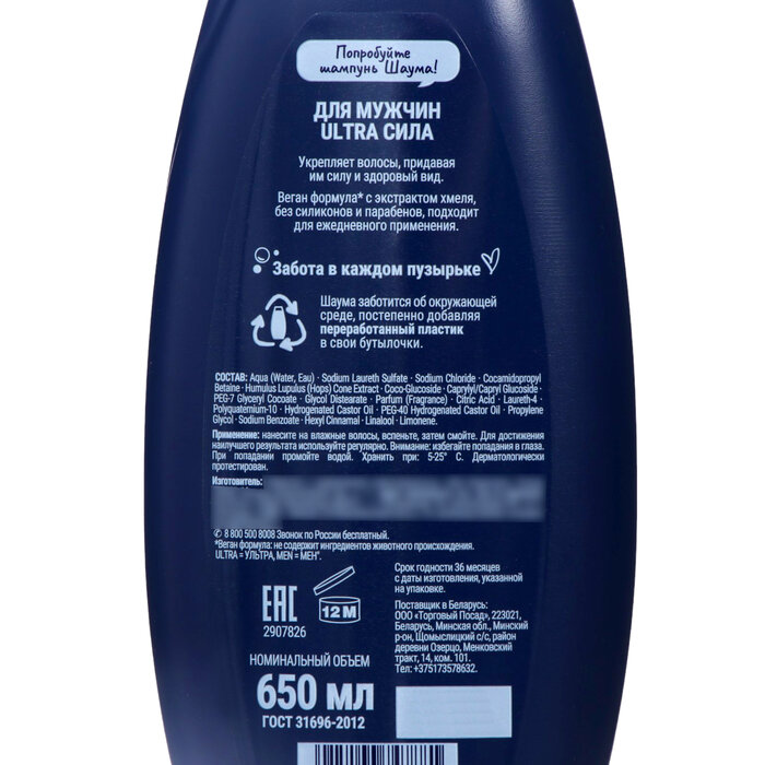 Шампунь для мужчин Шаума Men Ultra Сила, с экстрактом хмеля, для ежедневного применения, 650 мл
