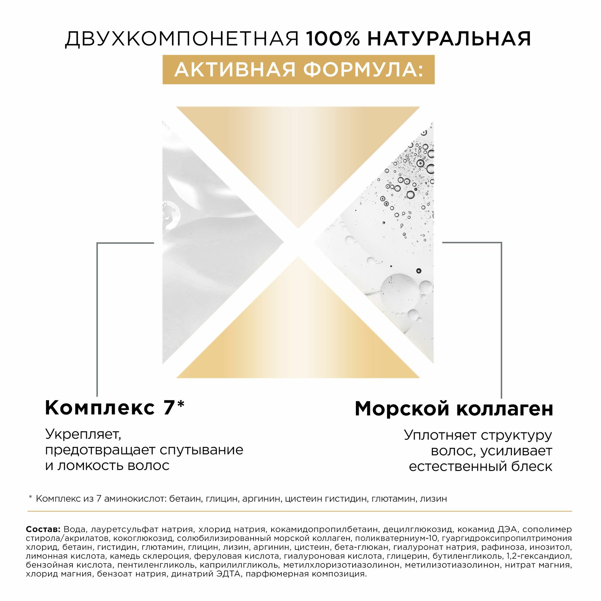 | Состав | Вода, лауретсульфат натрия, хлорид натрия, кокамидопропилбетаин, децилглюкозид, кокамид ДЭА, сополимер стирола/акрилатов, кокоглюкозид, солюбилизированный морской коллаген, поликватерниум-10, биотин, гуар гидроксипропилтримониум хлорид, бензойная кислота, лимонная кислота , метилхлоризотиазолинон, метилизотиазолинон, нитрат магния, хлорид магния, динатрий ЭДТА, парфюмерная композиция, бензоат натрия, гексилциннамал, линалоол, бензилсалицилат, лимонен. |
