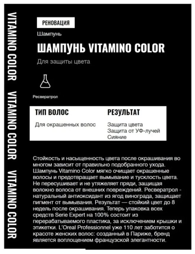 | Дополнительная информация | Бренд L'Oreal Professionnel - легендарный французский бренд профессиональной салонной косметики для волос с историей более 100 лет, положивший начало компании L'Oreal. Линия Expert Vitamino Color - это инновационная линия косметических средств, созданная специально для защиты окрашенных волос. Продукты данной линии разработаны на основе молекулы Incell и новой технологии Hydro Resist. Молекула Incell дает волосам жизненные силы, а водоотталкивающая защитная система Hydro Resist эффективно противостоит вымыванию цветных пигментов. В совокупности оба элемента отлично защищают окрашенные волосы от негативного воздействия воды, которая приподнимает волосяные чешуйки и вымывает пигменты. Регулярное использование косметических средств линии Vitamino Color поможет вам надолго сохранить желаемый цвет волос. Ваши волосы вновь станут блестящими, гладкими и шелковистыми. Теперь упаковка всех средств Serie Expert на 100% состоит из перерабатываемого пластика, за исключением крышки и этикетки. |