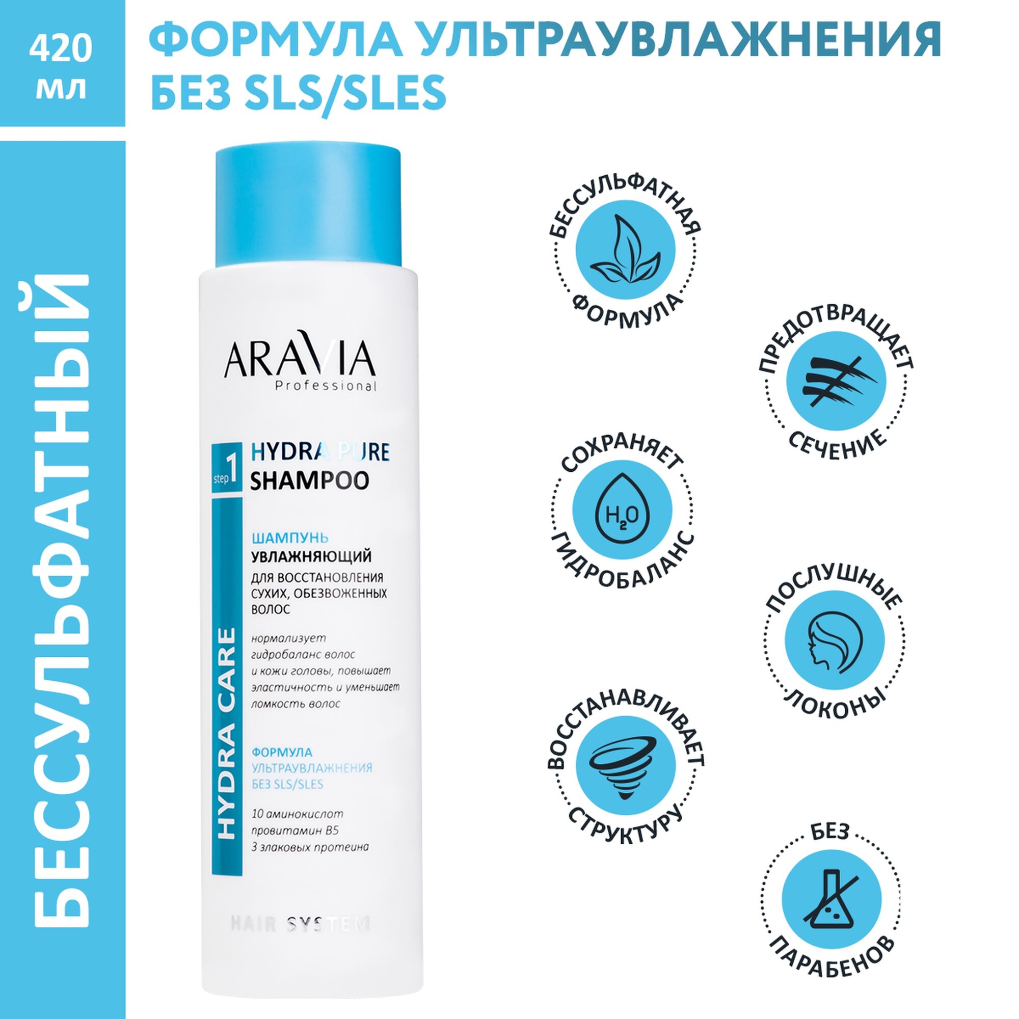 Купить ARAVIA Шампунь увлажняющий для восстановления сухих, обезвоженных волос Hydra Pure Shampoo, 420 мл