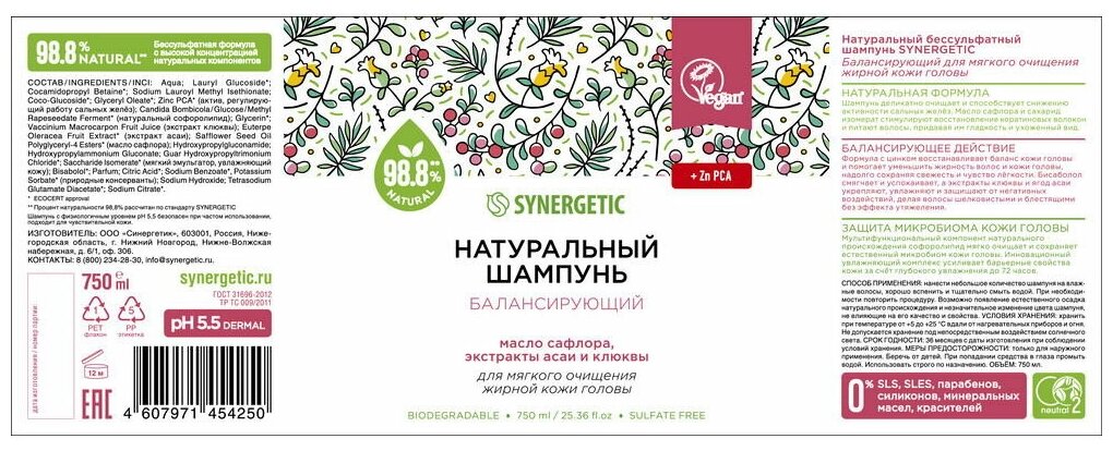 Натуральный бессульфатный шампунь SYNERGETIC Балансирующий для мягкого очищения жирной кожи головы, 750 мл интересное: