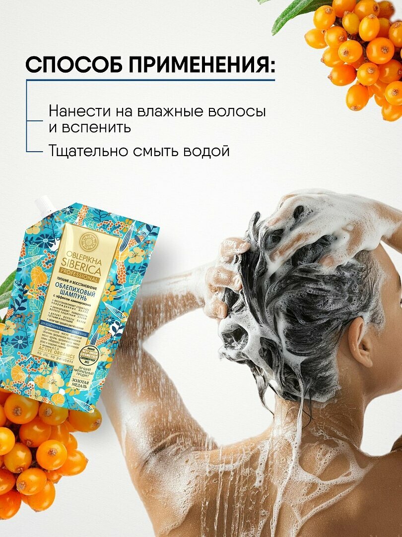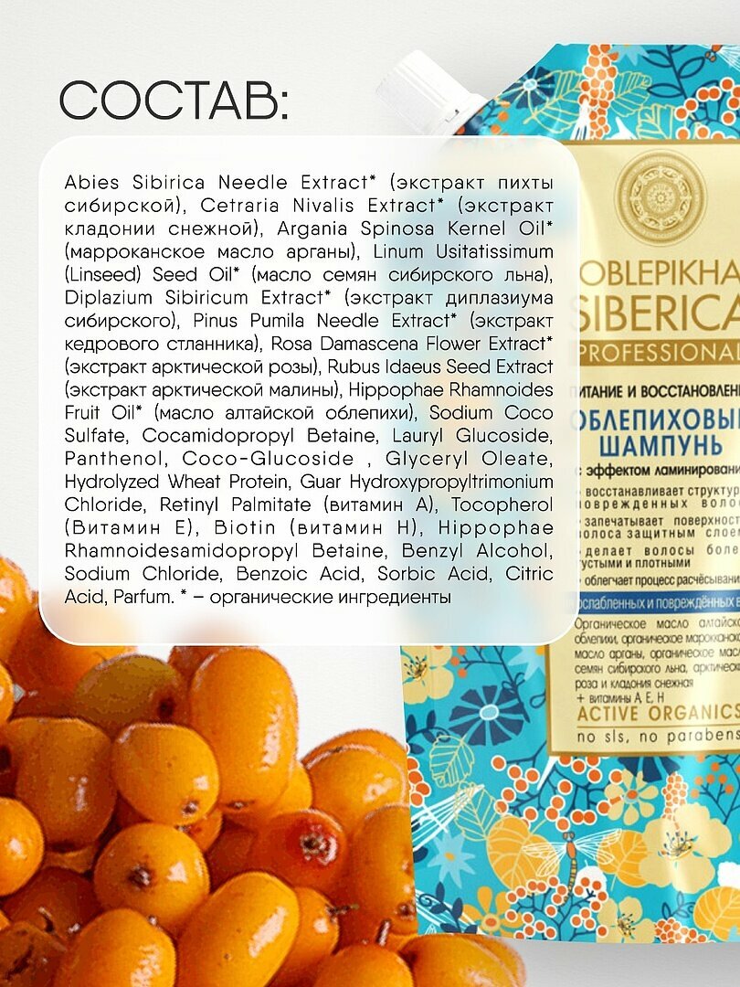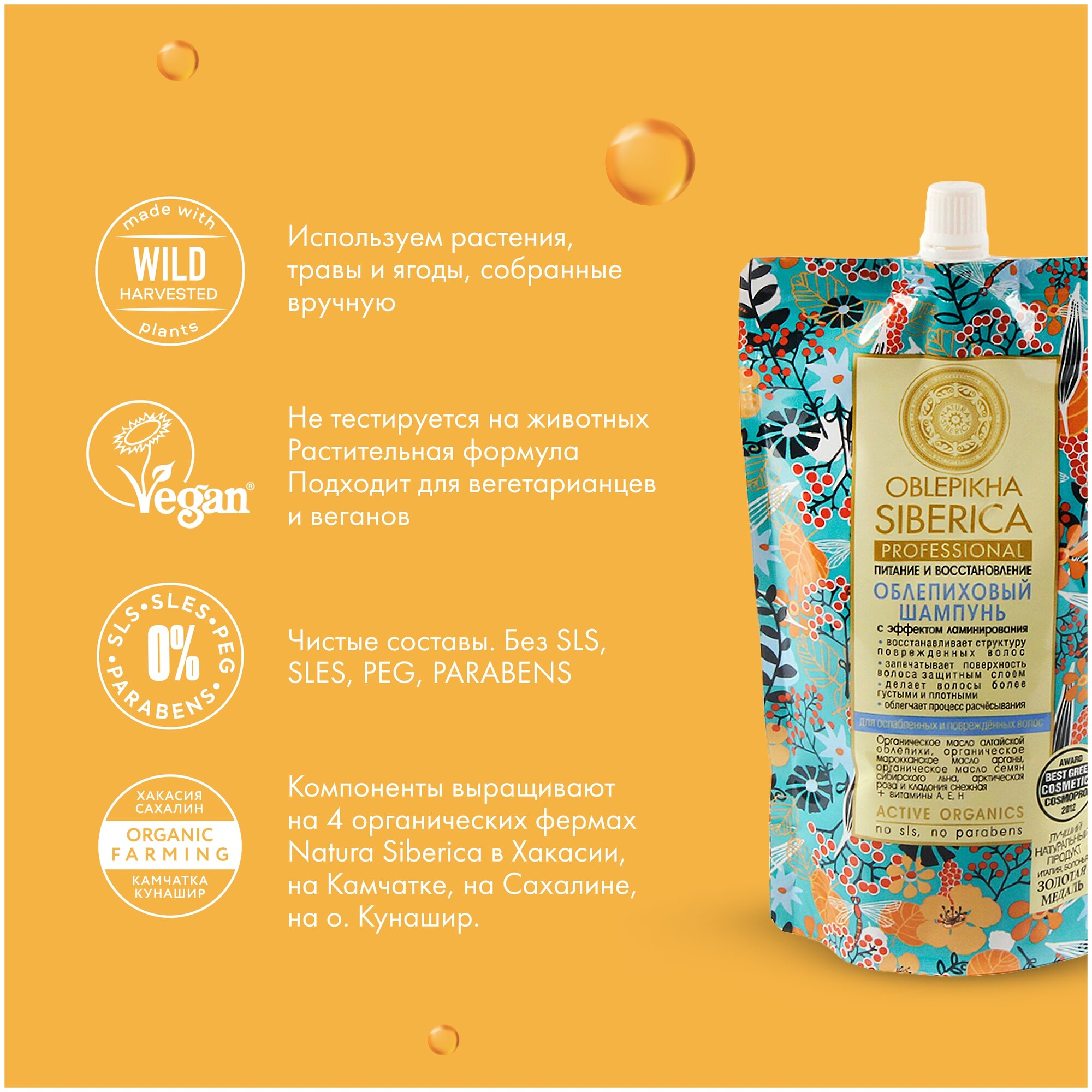 Natura Siberica Oblepikha Профессиональный облепиховый шампунь для поврежденных волос восстанавливающий питательный с эффектом ламинирования 500 мл