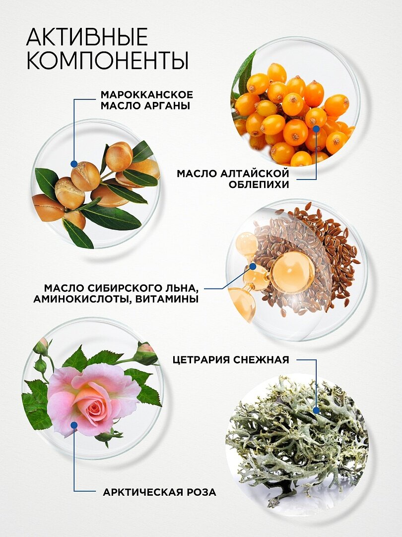 | Состав | aqua with infusions of: abies sibirica needle extract (экстракт пихты сибирской), cetraria nivalis extract (экстракт кладонии снежной), argania spinosa kernel oil (марроканское масло арганы), linum usitatissimum (linseed) seed oil (масло семян сибирского льна), diplazim sibiricum extract (экстракт диплазиума сибирского), pinus pumila needle extract (экстракт кедрового стланника), rosa damascena flower extract (экстракт арктической розы), rubus idaeus seed extract (экстракт арктической малины), hippophae rhamnoides fruit oil (масло алтайской облепихи), sodium coco-sulfate, cocamidopropyl betaine, lauryl gluciside, panthenol, coco-glucoside, glyceryl oleate, hydrolyzed wheat protein, guar hydroxypropyltrimonium chloride, retinyl palmitate (витамин а), tocopherol (витамин e), biotin (витамин н), hippophae rhamnoidesamidopropyl betaine, benzyl alcohol, sodium chloride, benzoic acid, sorbic acid, citric acid, parfum |