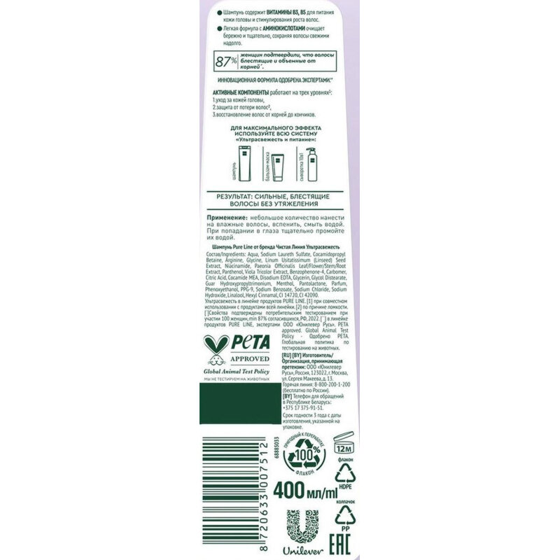 Шампунь Чистая линия Pure Line Ультрасвежесть и питание 400 мл