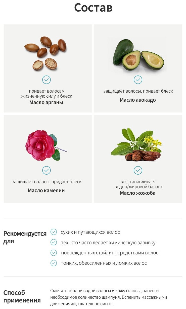 | Состав | Water, Cocamidopropyl Betaine, Disodium Laureth Sulfosuccinate, Lauramine Oxide, Glycerin, TEA-Cocoyl Glutamate, Butylene Glycol, PEG-120 Methyl Glucose Dioleate, Lauramide DEA, Sodium Benzoate, PEG-7 Glyceryl Cocoate, PPG-3 Caprylyl Ether, Citric Acid , Polyquaternium-10, Betaine, Hydroxypropyl Chitosan, Hydrolyzed Wheat Protein, Hydrolyzed Corn Protein, Hydrolyzed Soy Protein, Hydrolyzed Silk, Hydroxyacetophenone, Sodium Hyaluronate, Trehalose, Dipropylene Glycol, Zein, Argania Spinosa Kernel Oil , Persea Gratissima (Avocado) Oil, Camellia Japonica Seed Oil, Simmondsia Chinensis (Jojoba) Seed Oil |