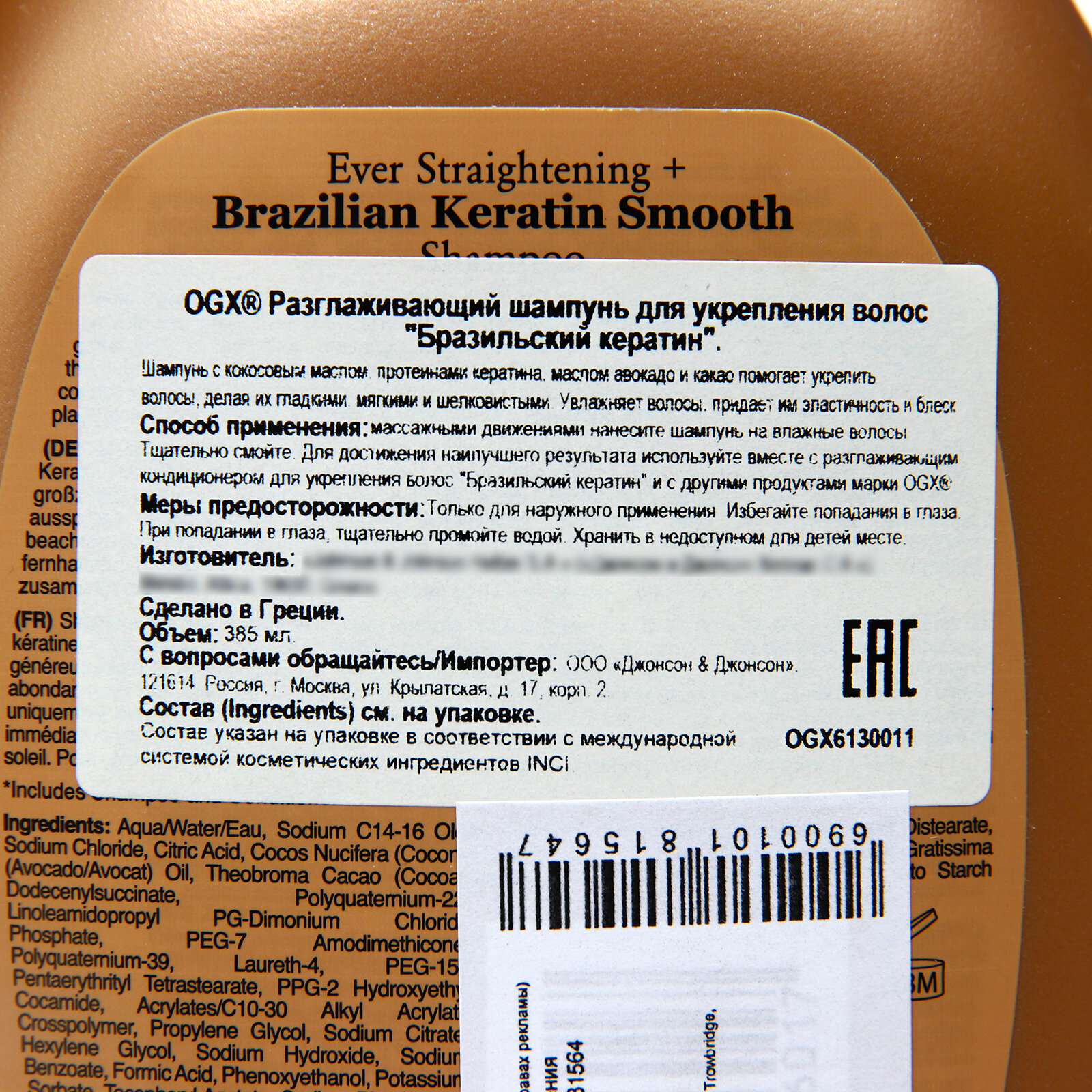 | Способ применения | массажными движениями нанесите шампунь на влажные волосы, тщательно смойте, для достижения наилучшего результата используйте вместе с разглаживающим и кондиционером для укрепления волос "Бразильский кератин" и другими продуктами марки OGX |