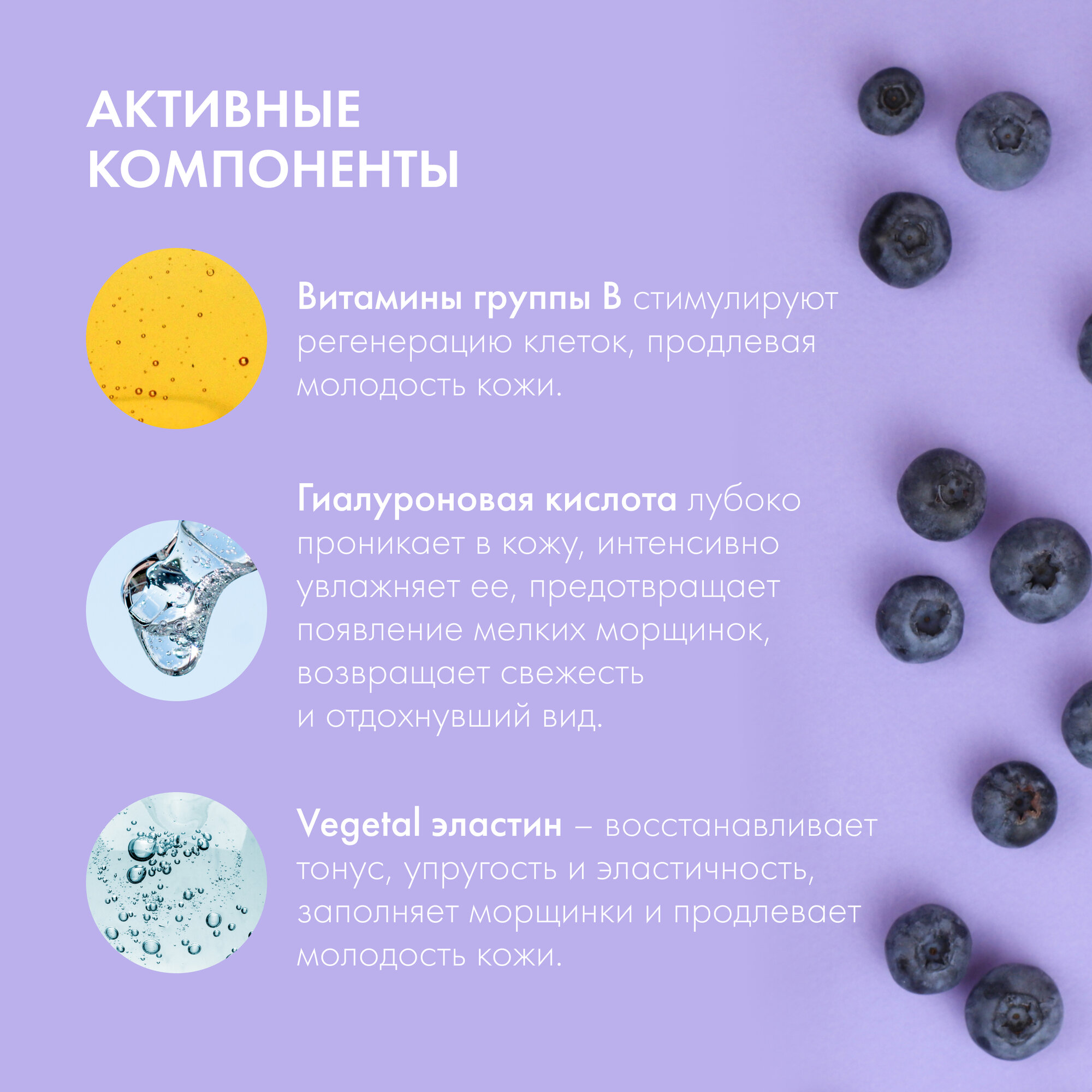 | Активный ингредиент | антиоксиданты / гиалуроновая кислота / эластин |