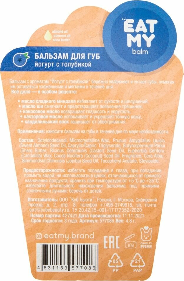EAT MY бальзам для губ "Йогурт с голубикой" интересное: