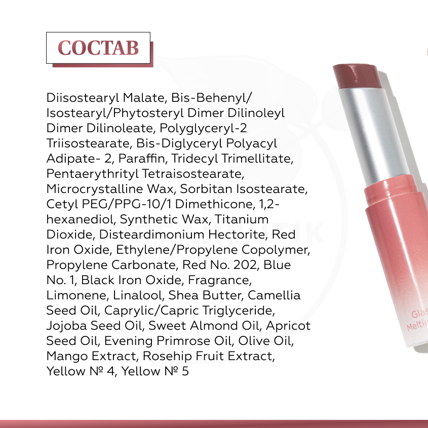| Состав | Diisostearyl Maleate, Bis-Behenyl/Isostearyl/Phytosteryl Dimer Dilinoleyl Dimer Dilinoleate, Polyglyceryl-2 Triisostearate, Bis-Diglyceryl Polyacyl Adipate- 2, paraffin, tridecyl trimellitate, pentaerythrityl tetraisostearate, microcrystalline wax, sorbitan isostearate, 1,2-hexanediol, disteadymonium hectorite, synthetic wax, titanium Dioxide, Ethylene/Propylene Copolymer, Red Iron Oxide, Red No. 202, Propylene Carbonate, Blue No. 1, Black Iron Oxide, Fragrance, Limonene, Linalool, Shea Butter, Camellia Seed Oil, Caprylic/Capric Triglyceride, Argan Kernel Oil, Sweet Almond Oil, Apricot Seed Oil, Evening Primrose Oil, Olive Oil, Jojoba Seed Oil, Mango Extract, Rosehip Fruit Extract |