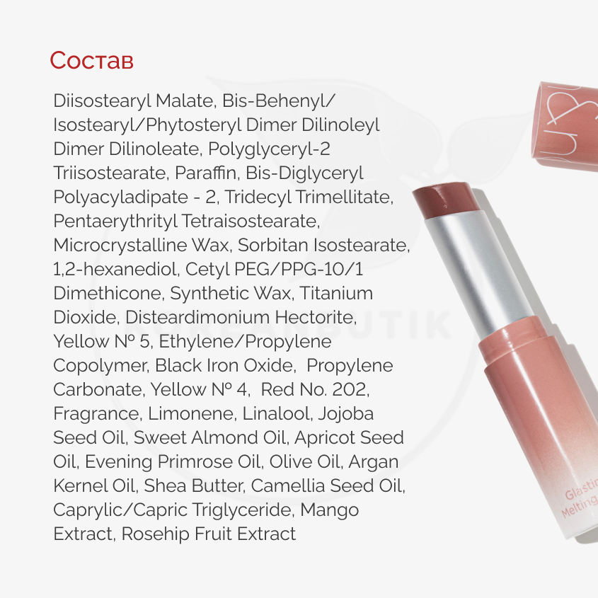 | Состав | Diisostearyl Maleate, Bis-Behenyl/Isostearyl/Phytosteryl Dimer Dilinoleyl Dimer Dilinoleate, Polyglyceryl-2 Triisostearate, Bis-Diglyceryl Polyacyl Adipate- 2, paraffin, tridecyl trimellitate, pentaerythrityl tetraisostearate, microcrystalline wax, sorbitan isostearate, 1,2-hexanediol, disteadymonium hectorite, synthetic wax, titanium Dioxide, Ethylene/Propylene Copolymer, Red Iron Oxide, Red No. 202, Propylene Carbonate, Blue No. 1, Black Iron Oxide, Fragrance, Limonene, Linalool, Shea Butter, Camellia Seed Oil, Caprylic/Capric Triglyceride, Argan Kernel Oil, Sweet Almond Oil, Apricot Seed Oil, Evening Primrose Oil, Olive Oil, Jojoba Seed Oil, Mango Extract, Rosehip Fruit Extract |