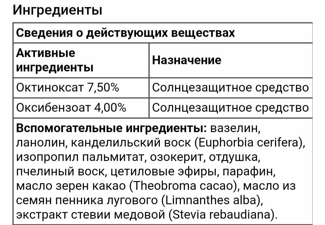 | Состав | Активные ингредиенты: Белый вазелин 41,25%, Неактивные Ингредиенты: ланолин, масло семян какао теобромы, воск молочая цериферного, пчелиный воск, цетиловые эфиры, озокерит, парафин, масло семян лимнантеса альба, камфора, ментол, салициловая кислота, фенол, ароматизатор, ванилин |