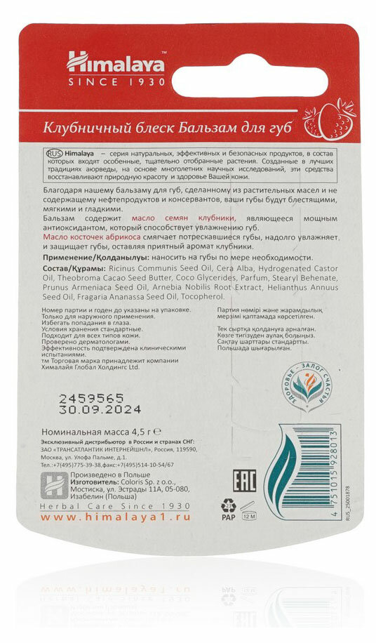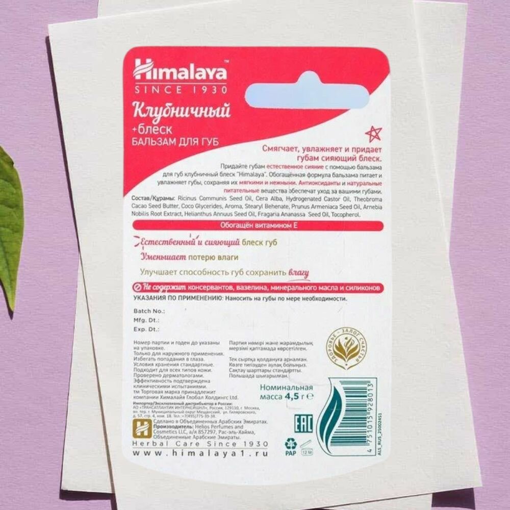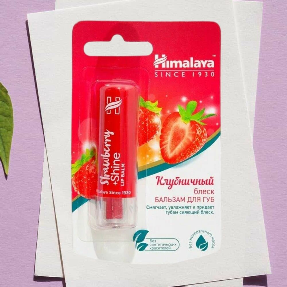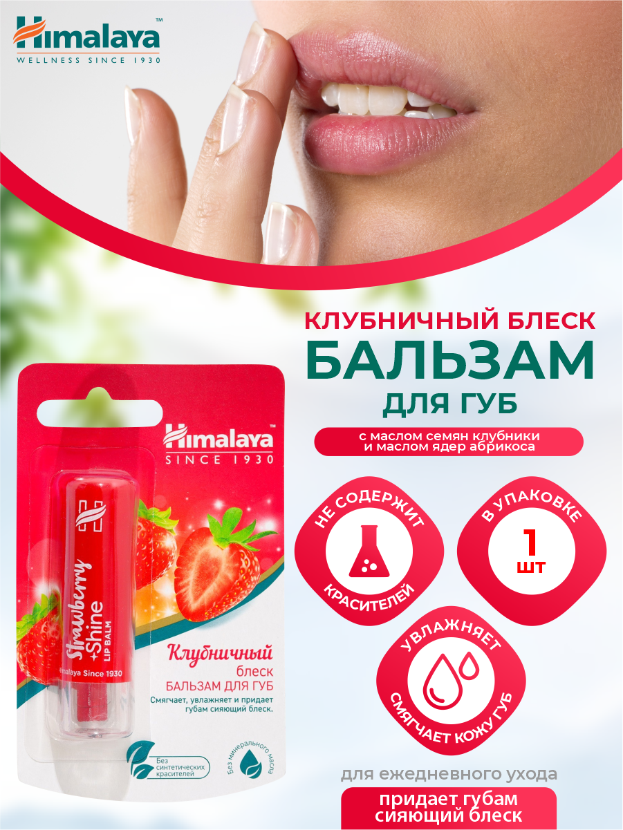 Himalaya Since 1930 Бальзам для губ "Клубничный блеск" увлажняющий, питательный, натуральный, оттеночный, 10 г.
