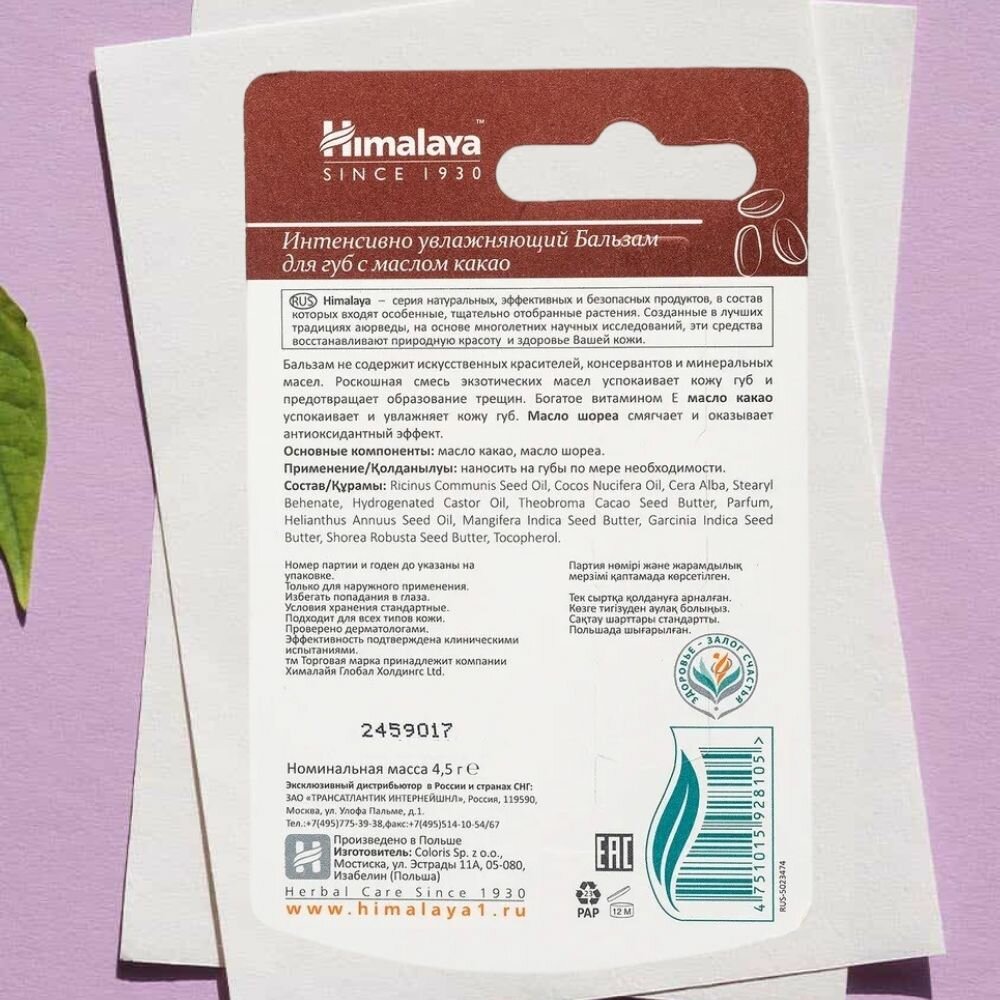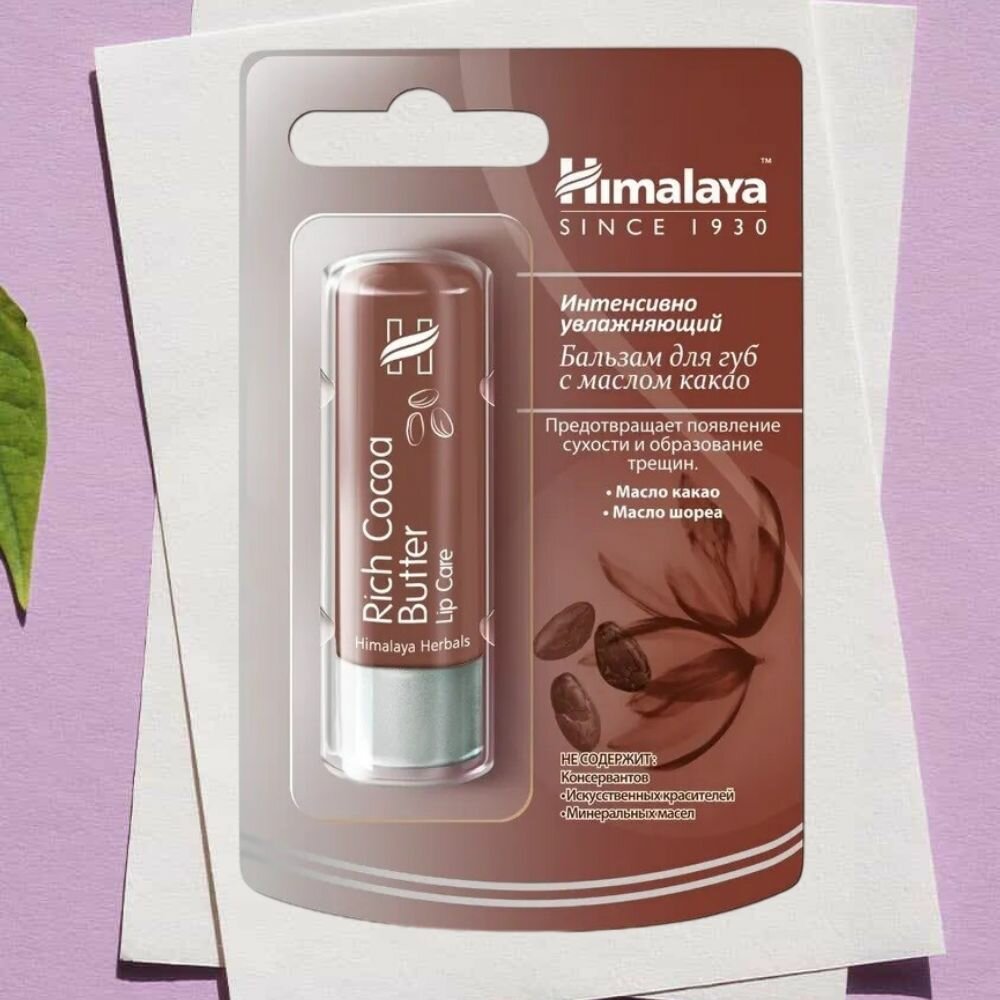 Himalaya Herbals Бальзам для губ интенсивно увлажняющий с маслом какао, 4.5 г, 2 шт