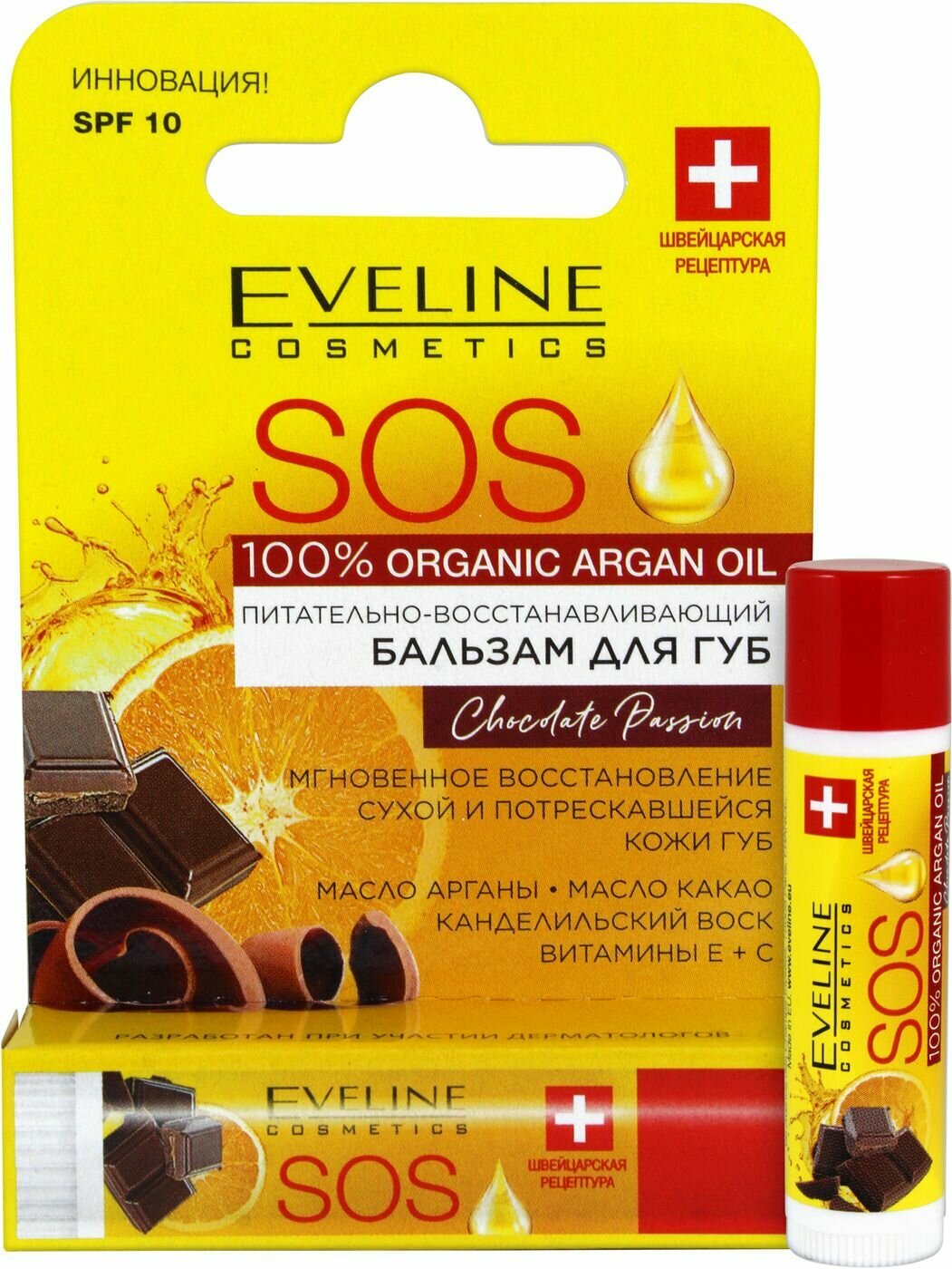EVELINE Бальзам для губ SOS ARGAN OIL CHOCOLATE PASSION восстанавливающий, 4,5 г