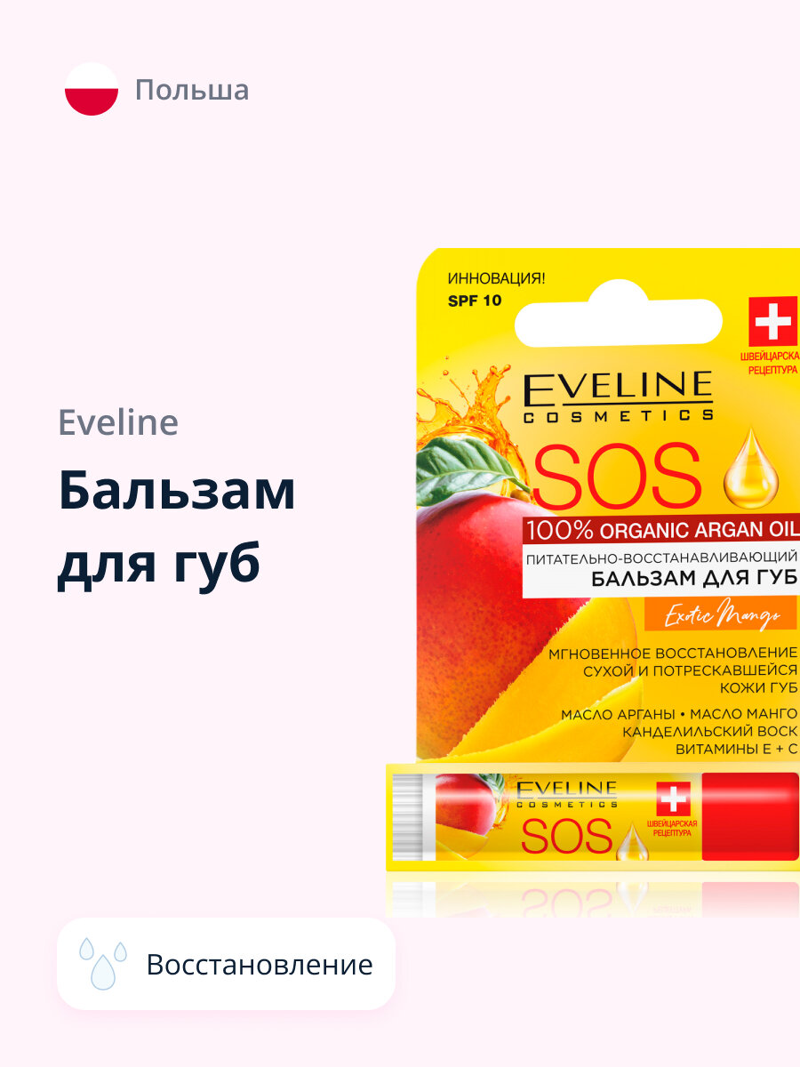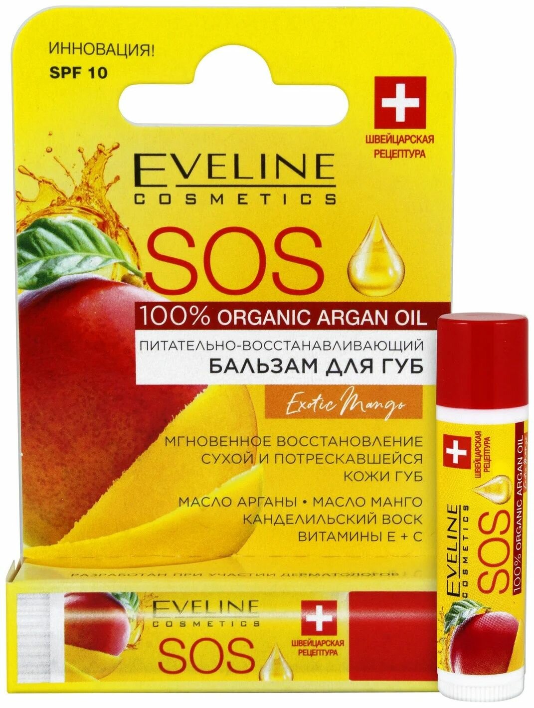 Eveline Cosmetics Бальзам для губ Питательно-Восстанавливающий SOS 100% ORGANIC ARGAN OILEXOTIC MANGO, 4,5 г