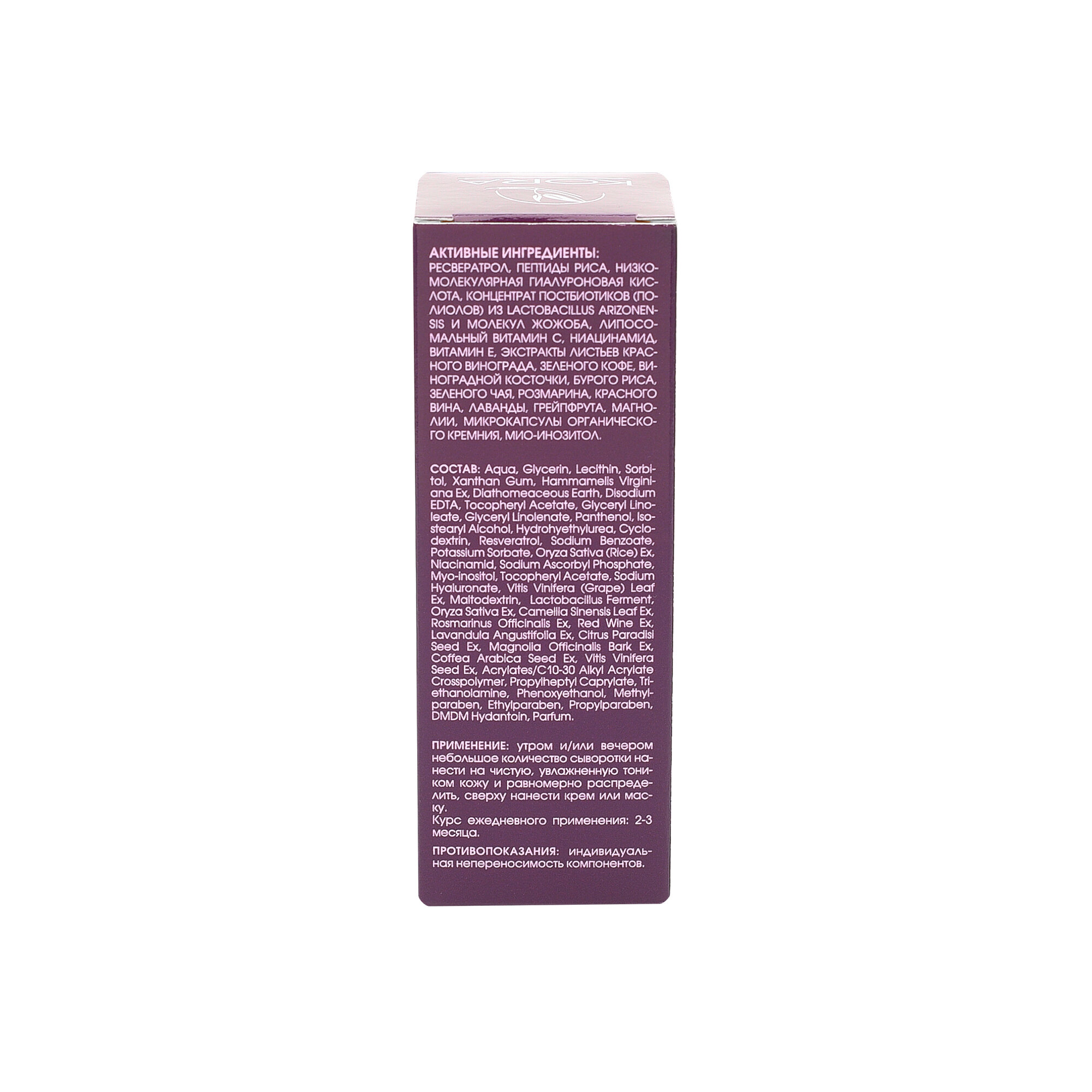 | Состав | Aqua, Glycerin, Lecithin, Sorbitol, Xanthan Gum, Hammamelis Virginiana Extract, Diathomeaceous Earth, Disodium EDTA, Tocopheryl Acetate, Glyceryl Linoleate, Glyceryl Linolenate, Panthenol, Isostearyl Alcohol, Hydrohyethylurea, Cyclodextrin, Resveratrol, Sodium Benzoate, Potassium Sorbate, Oryza sativa (Rice) Extract, Niacinamid, Sodium Ascorbyl Phosphate, Myo-inositol, Tocopheryl Acetate, Sodium Hyaluronate, Vitis Vinifera (Grape) Leaf Extract, Maltodextrin, Lactobacillus ferment, Oryza sativa extract, Camellia sinensis leaf extract, Rosmarinus officinalis extract, Red wine extract, Lavandula angustifolia extract, Citrus paradisi seed extract, Magnolia officinalis bark extract, Coffea Arabica Seed Extract, Vitis Vinifera Seed Extract, Acrylates/C10-30 Alkyl Acrylate Crosspolymer, Propylheptyl Caprylate, Triethanolamine, Phenoxyethanol, Methylparaben, Ethylparaben, Propylparaben, DMDM Hydantoin, Parfum |