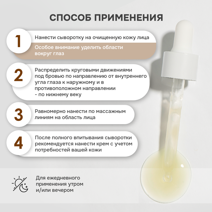 | Способ применения | нанести сыворотку на очищенную кожу лица. Особое внимание уделить области вокруг глаз. Распределить по массажным линиям. После полного впитывания сыворотки рекомендуется нанести крем |