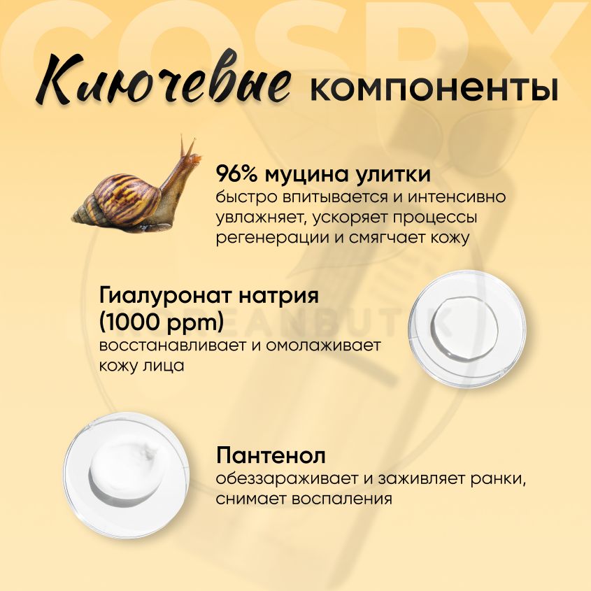 Ниже Вы можете прочитать отзывы на COSRX Essence Advanced Snail 96 Mucin Power Эссенция для лица с фильтратом улитки, 100 мл, ознакомится с подробными характеристиками, посмотреть интересные обзоры и фотографии на COSRX Essence Advanced Snail 96 Mucin Power Эссенция для лица с фильтратом улитки, 100 мл.