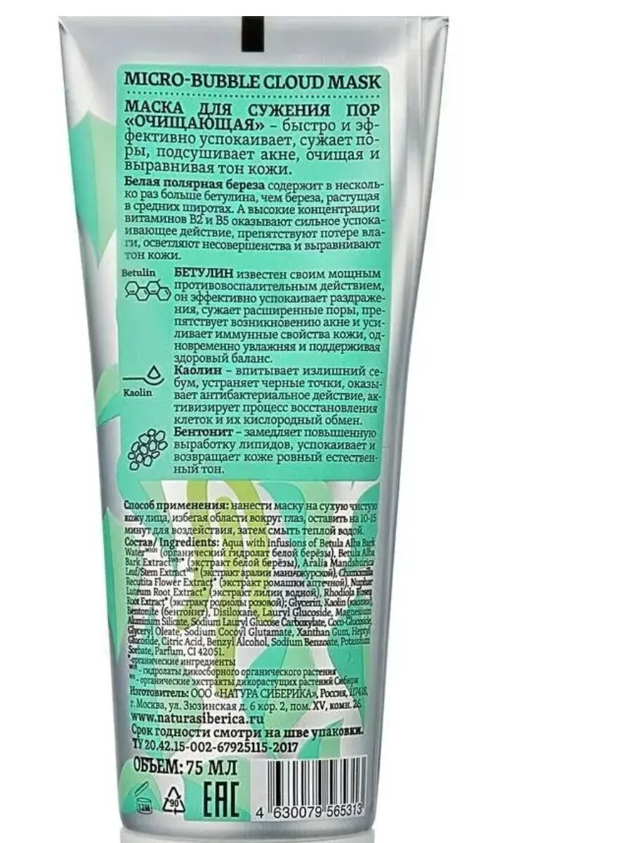 Natura Siberica Bereza Очищающая пузырьковая глиняная маска для сужения пор для проблемной кожи лица от черных точек и прыщей 75 мл