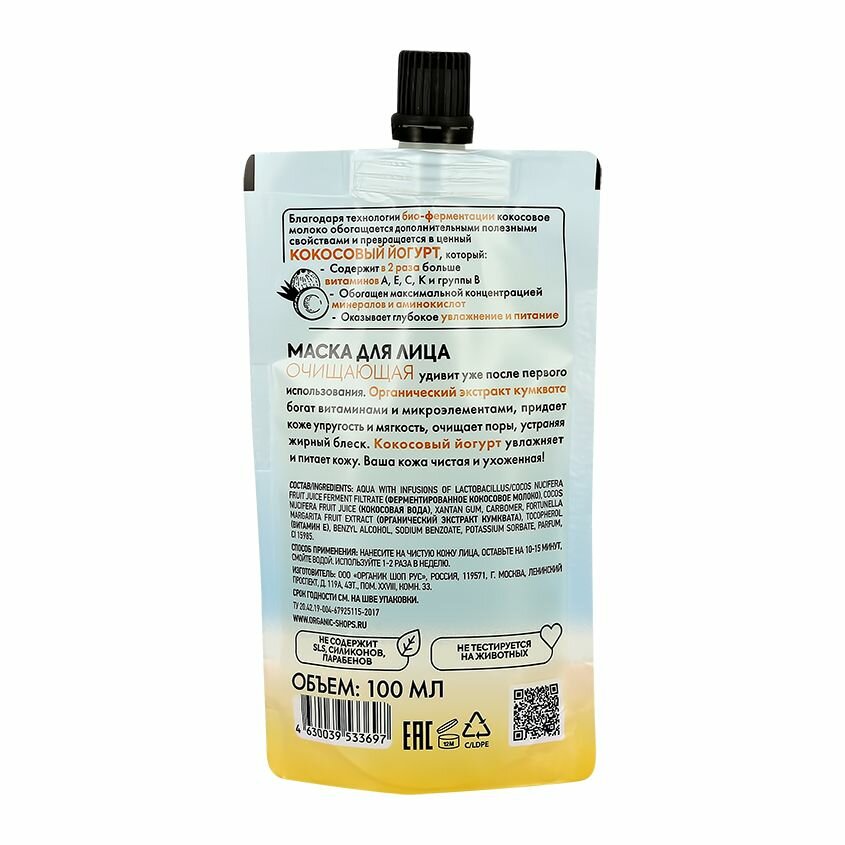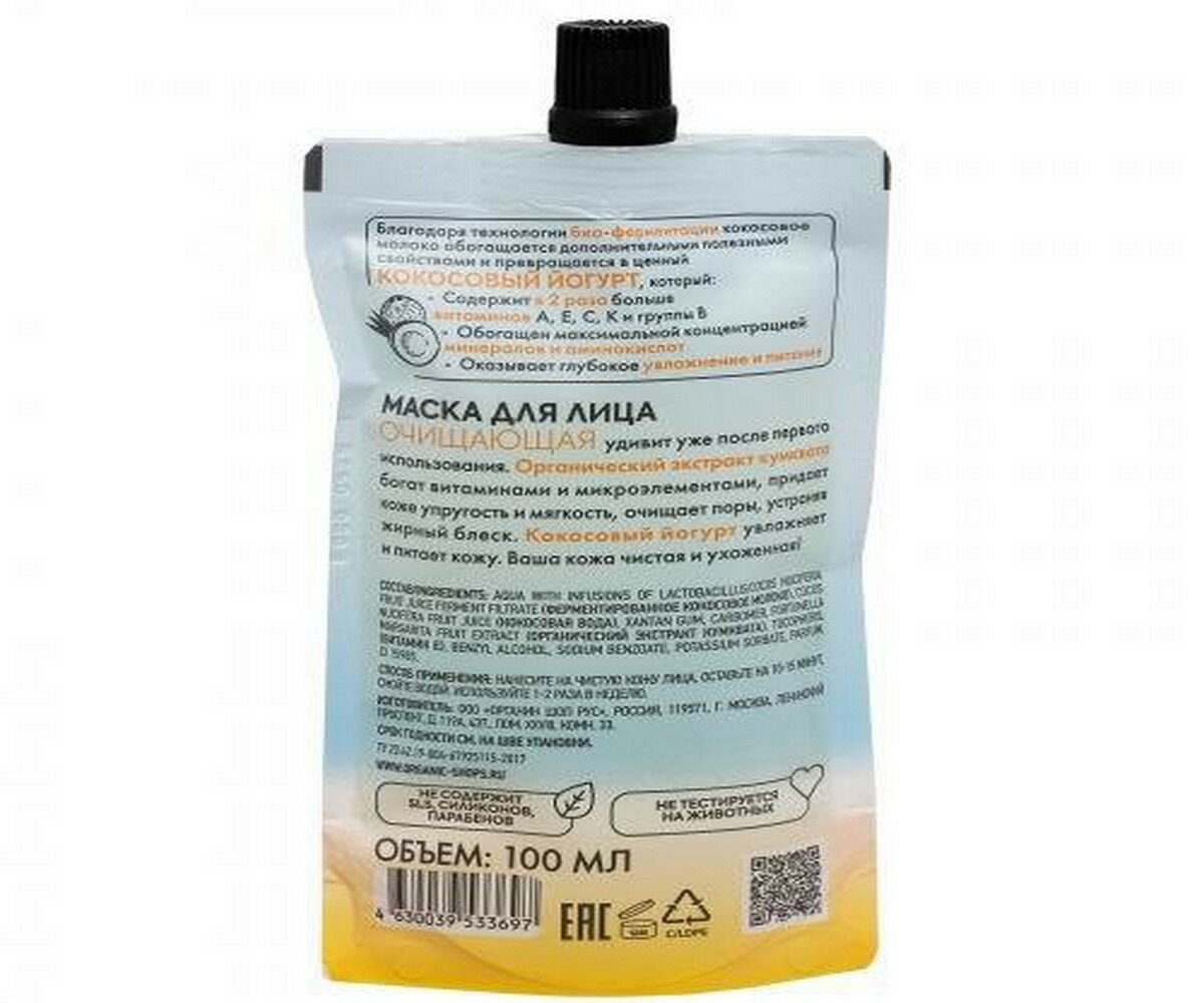 Маска для лица ORGANIC SHOP Coconut yogurt Очищающая, 100 мл