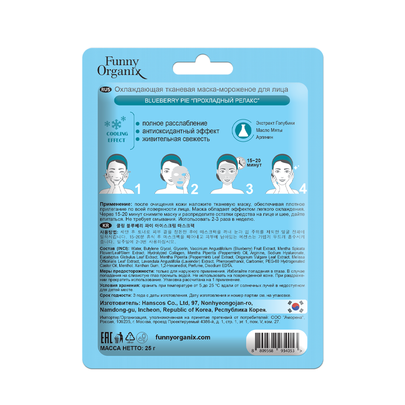 Охлаждающая тканевая маска-мороженое для лица Funny Organix Blueberry Pie Прохладный Релакс 1*22 г интересное: