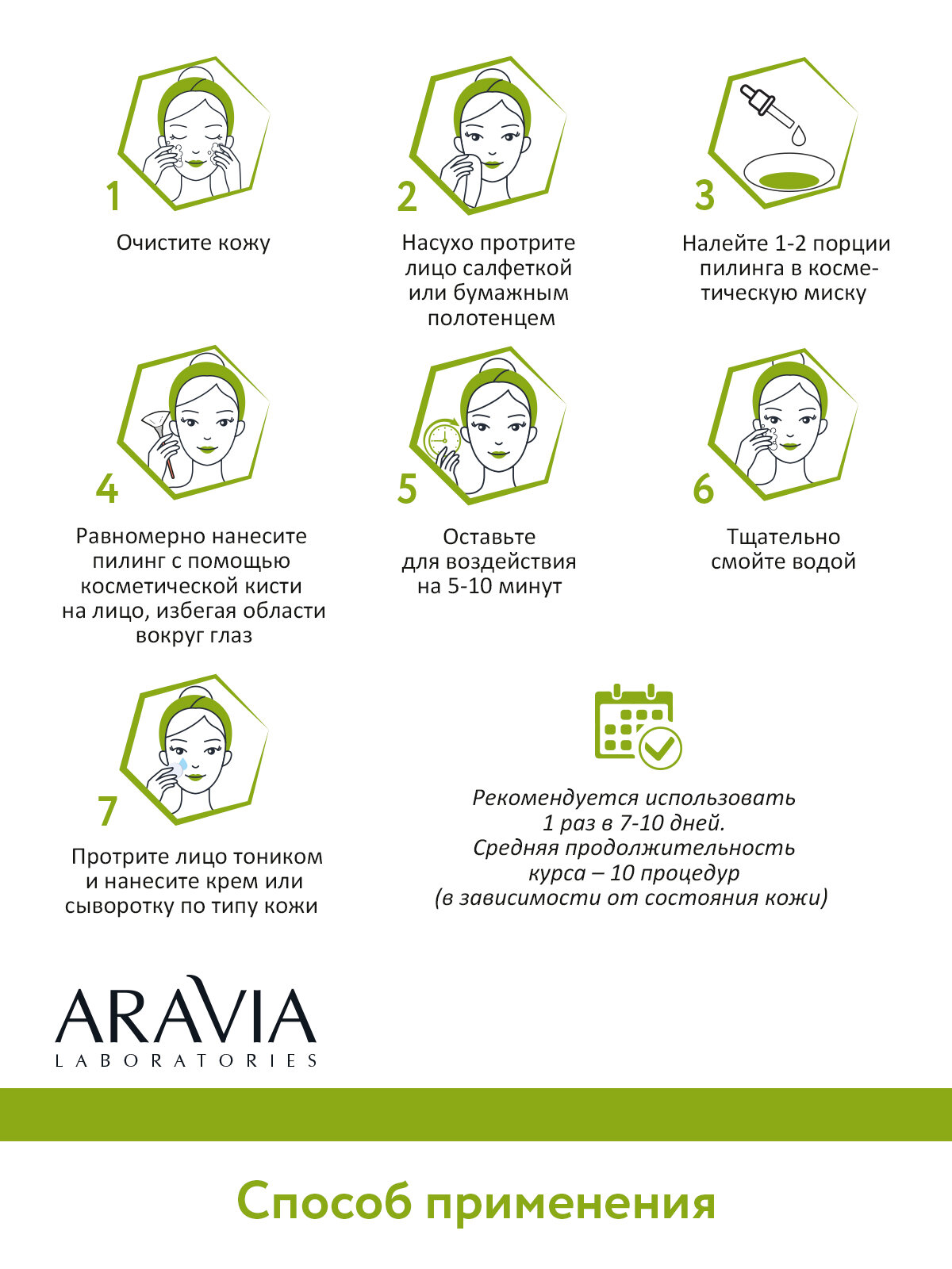 | Способ применения | равномерно нанесите пилинг с помощью косметической кисти на предварительно очищенное сухое лицо, избегая область вокруг глаз. Оставьте для воздействия на 5-10 минут. Тщательно смойте водой. Нанесите тоник и увлажняющий крем. Используйте 1 раз в 7-10 дней. Средняя продолжительность курса – 10 процедур (в зависимости от состояния кожи). |