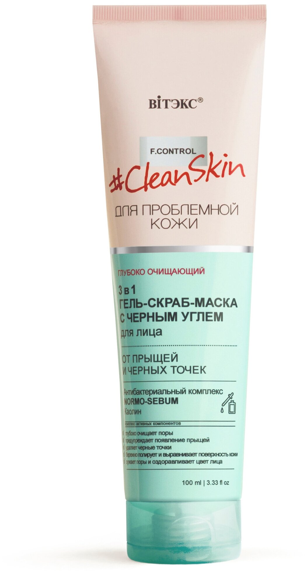 Витэкс F Control Clean Skin 3 в 1 гель-скраб-маска для лица от прыщей и черных точек с черным углём 100 мл