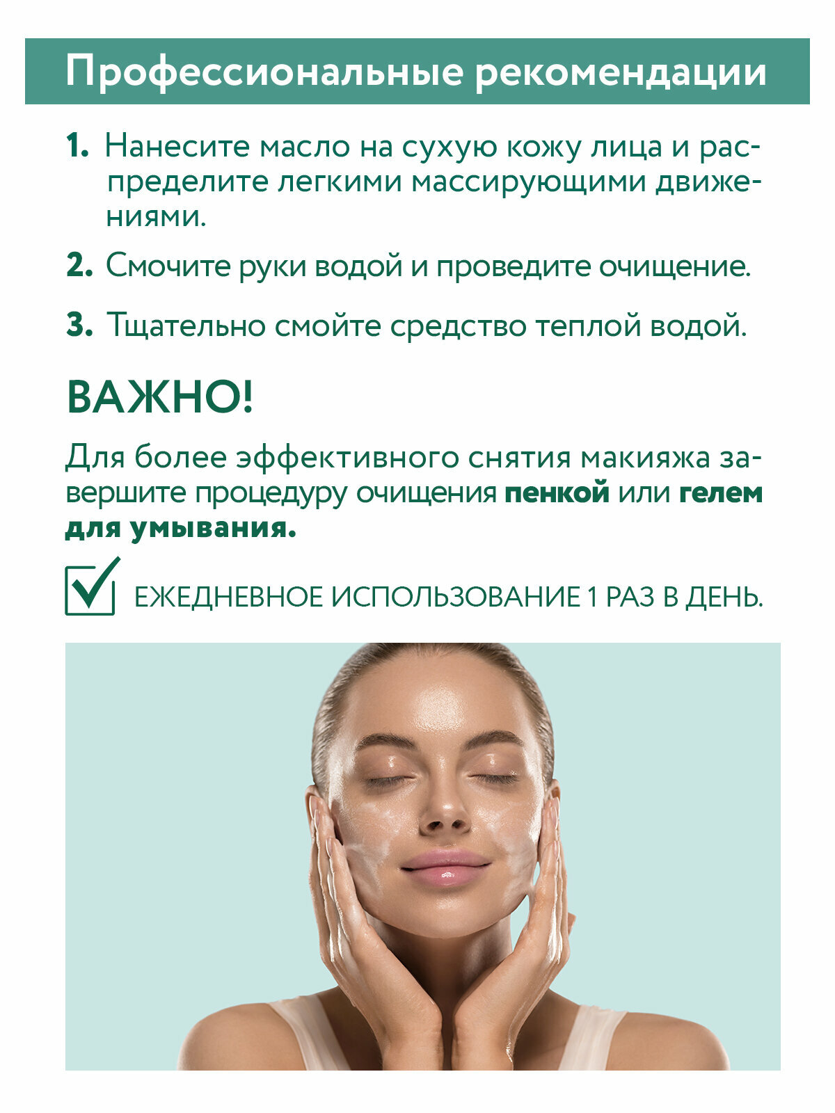 | Способ применения | нанесите масло на сухую кожу лица и распределите легкими массирующими движениями. Влажными руками проведите очищение и смойте теплой водой. При необходимости дополнительно используйте пенку или гель для умывания. |