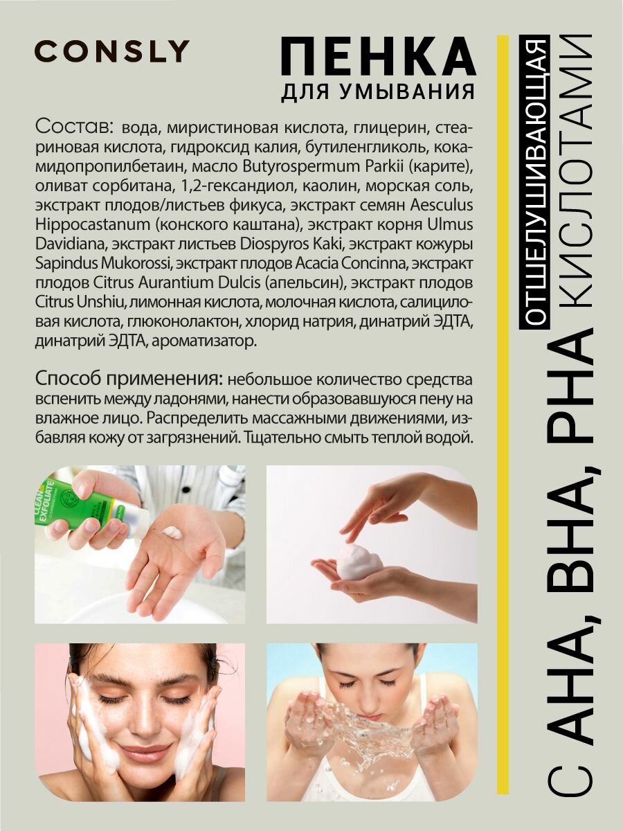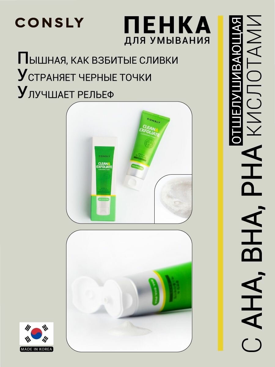 CONSLY Пенка для умывания лица Корея очищающая для снятия макияжа (остатков) и удаления себума. Отшелушивающая пенка с кислотами AHA, BHA, PHA Cleansing Foam Clean&Exfoliate уходовая косметика 120мл интересное: