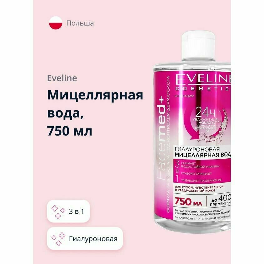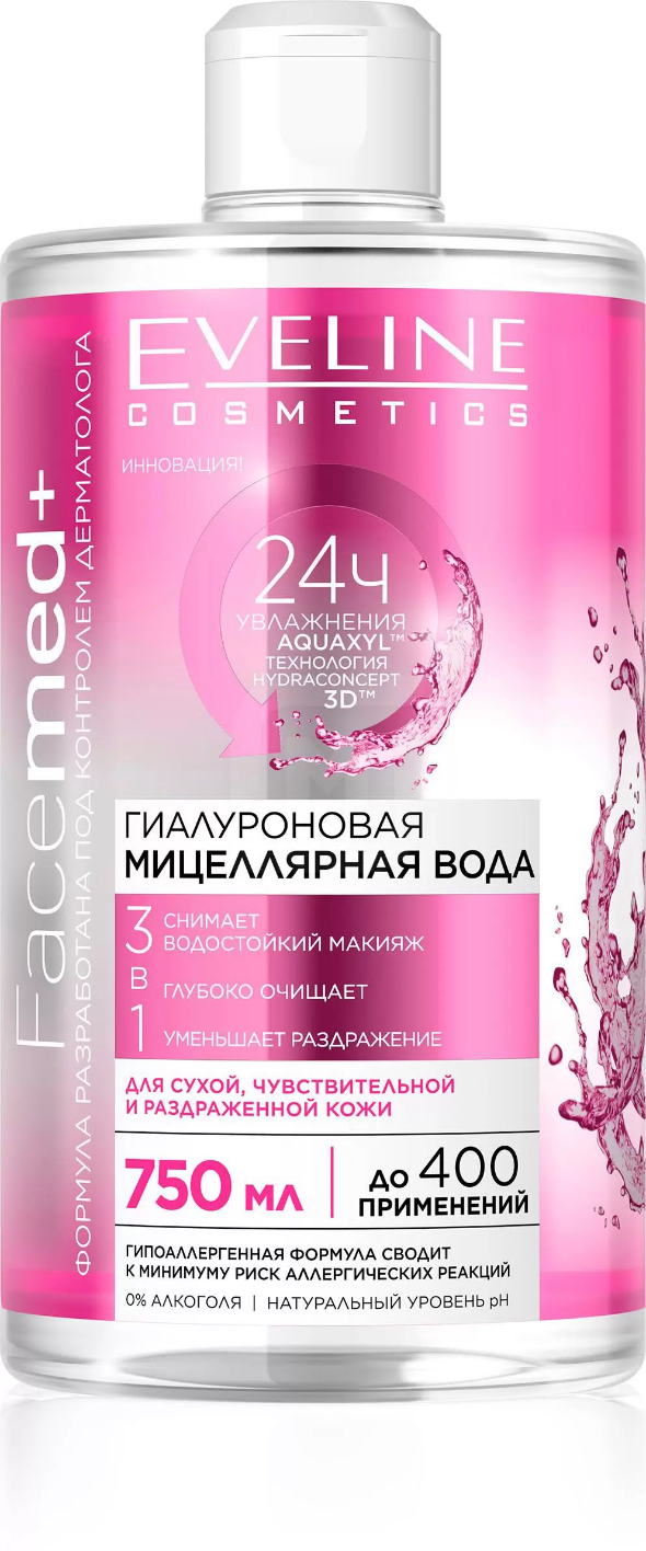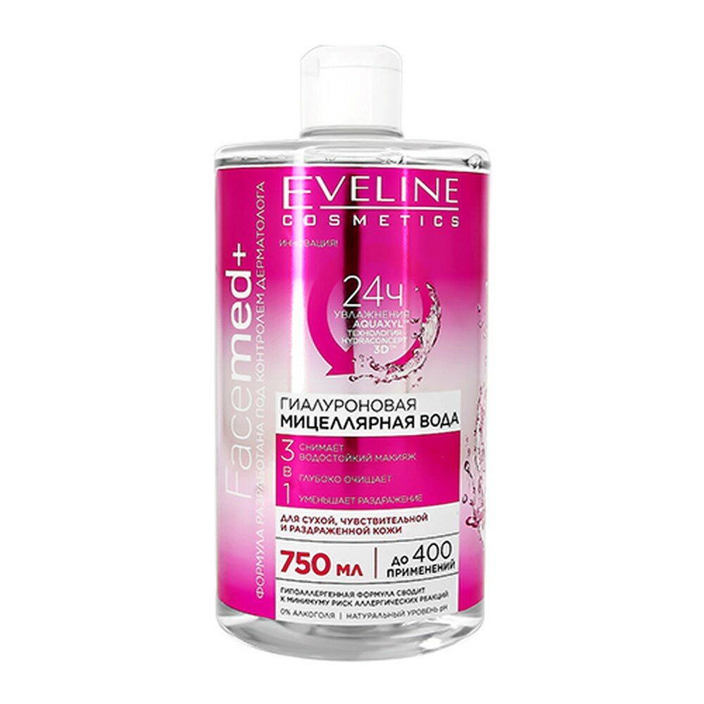 Мицеллярная вода для лица EVELINE, FACEMED +, 3 в 1, гиалуроновая, 750 мл