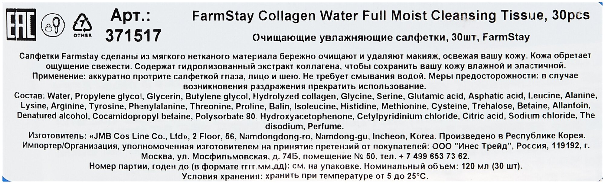FarmStay Collagen Water Full Moist Cleansing Tissue Очищающие увлажняющие салфетки для снятия макияжа, 30 шт, Корея интересное: